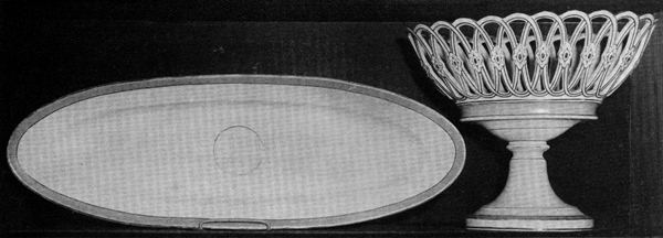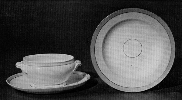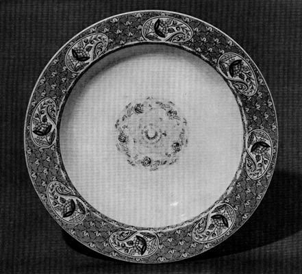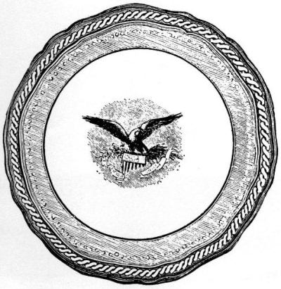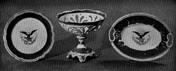 The picture of the design presented for President Pierce’s inspection in 1853 which appears in the catalog of the New York Crystal Palace Exhibition[4] is proof of the readiness with which symbolism is read into a design which came into existence long[Pg 114] before the symbol is appropriate. Writing in 1895 Edwin Atlee Barber says of the Lincoln China that the design for the decoration, selected after much consultation among officials at Washington, was added in New York by the importer. It consisted of a spirited rendering of the arms of the United States—the American eagle mounted on the national shield and beneath it the motto E Pluribus Unum. This design was engraved and then transferred to the china as an outline to be filled in with color. The border of the plate, a gold guilloche, or cable, of two strands entwined and, thus, mutually strengthening each other, was intended to signify the union of the North and South.[5] The same idea was meant to be conveyed in the central design: “Though clouds surround our Country, the sunlight is breaking through.” The explanation of the symbolism of the design, while appropriate for the Lincoln Administration, could hardly have been true for the china which was originally designed for Presidential use in 1853.