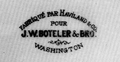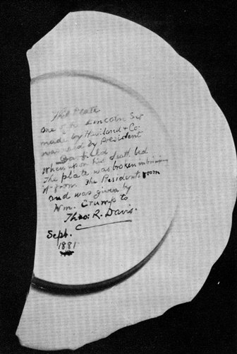 Tradition identifies the blanks on which the design of the Lincoln china was painted as being imported from the Haviland factory in Limoges, France. The original china bears no maker’s mark, however, as this was more than ten years before the Haviland factory started to mark their ware.[6] The earliest positive link of the Lincoln china to Haviland and Company seems to be an affidavit which Theodore R. Davis attached to a Lincoln plate in 1881 saying “This plate One of the Lincoln Set made by Haviland & Co. was used by President Garfield when upon his death bed. The plate was broken in bringing it from the President’s room and was given by Wm. Crump to Theo. R. Davis Sept. 1881.” The plate is now in the collections of the State Historical Society of Wisconsin. It is possible that Theodore Davis,[Pg 115] a personal friend of Theodore Haviland, had derived directly from Mr. Haviland this manufacturer identification of the china which Haughwout decorated.
