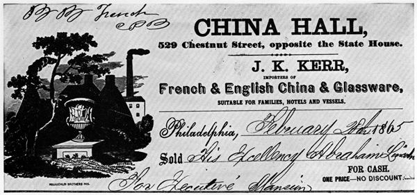 The extent to which this controversy spoiled Mrs. Lincoln’s pleasure in the handsome purple service perhaps can be measured by the fact that after President Lincoln was re-elected, she purchased another large china service for the White House. A bill, recently discovered at the National Archives,[Pg 116] documents the new set as being ordered by Mrs. Lincoln from J. K. Kerr of 529 Chestnut Street, Philadelphia, whose establishment, known as China Hall, specialized in French and English china and glassware. Dated January 30, 1865, the bill was for:[9]