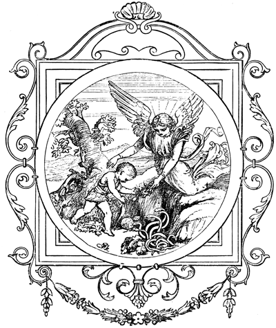 This book consisted of nearly a hundred Latin Epigrams, some original, some translated or paraphrased from the Greek, and each accompanied by a[x] rude woodcut illustration. Alciati was the first author who gave the name of Emblem to this form of expressing his ideas: and the notion for so doing was suggested by the original meaning of the word Emblem, which signifies anything inserted. The Greeks and Romans used to insert small pictures or bas-reliefs in the sides of vases, drinking-cups, and various other utensils: these little works of art were called Emblems: they were sometimes accompanied by mottoes or verses, and often made removable at pleasure, so that they formed no necessary part of the article which they adorned.