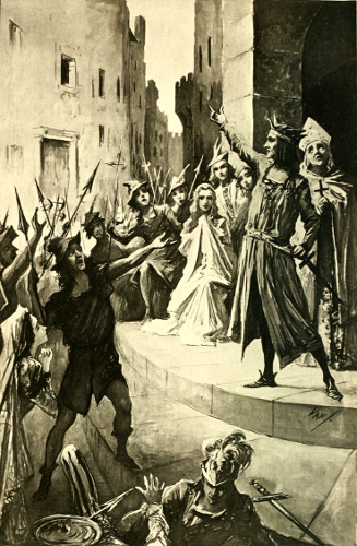 But meanwhile the whole body of the townsmen and the apprentices had gathered before the palace, and their one cry was for Antonio. For the fear of the Duke being no longer upon them, and the pikemen not knowing whom to obey and being therefore disordered, the people became very bold, and they had stormed the palace, had not one come to Antonio and implored him so show himself, that the people might know that he was safe. Therefore he came forward with the Lady Lucia, who was now no more bewildered, nor petrified with fear or astonishment, but was weeping with her eyes and smiling with her lips and clinging to Antonio's arm. And when the people saw them thus, they set up a great shout, that was heard far beyond the city walls; and the apprenticed lads turned and ran in a body across the square, and swarmed on to the scaffold. And then and there they plucked down the gibbet and worked so fiercely that in the space of half an hour there was none of it left.