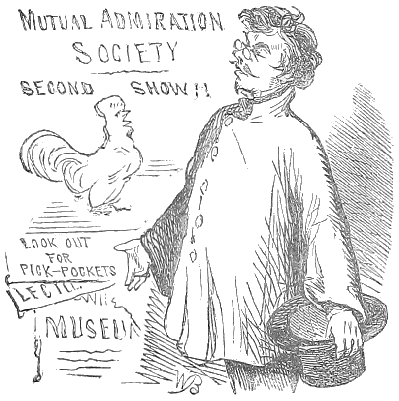 Now, the only objection I ever raised to this title was that it was not sufficiently lengthy! When applied to for my own views on the subject, I recommended that it should be called the "Mutual Admiration Society." But, though I[Pg 15] was thought a great deal of by its members,—especially when the concern was short of funds,—in this case they thought my proposed title was altogether too applicable; and the original name, above quoted, was adhered to.