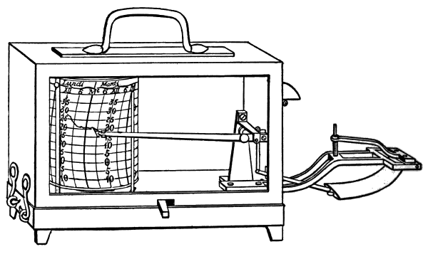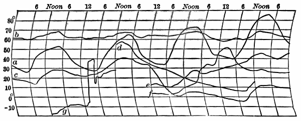 Temperature.—In keeping a record[2] of temperature without the use of a thermometer, excellent practice is given in observations of the temperature actually felt by the human body. Our bodies are not thermometers. They do not indicate, by our sensations of heat or cold, just what is the temperature of the surrounding air, but they try to adjust themselves to the conditions in which they are. This adjustment depends on many things beside the temperature of the air; e.g., the moisture or humidity of the air; the movement of the air; the temperature and the nearness of surrounding objects. In summer, a day on which the temperature reaches 80° or 85° often seems much hotter than another day on which the temperature rises2 to 95°. In winter, temperatures registered by the thermometer as 10° or 15° above zero often feel a great deal colder than temperatures of -5° or -10°. In recording your observations on temperature, the record book may be divided into columns as follows:—