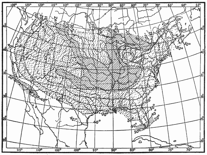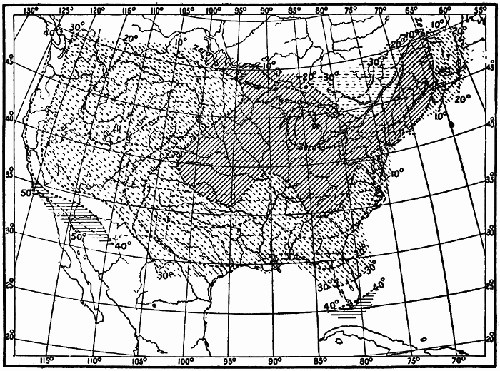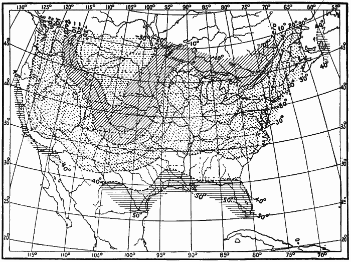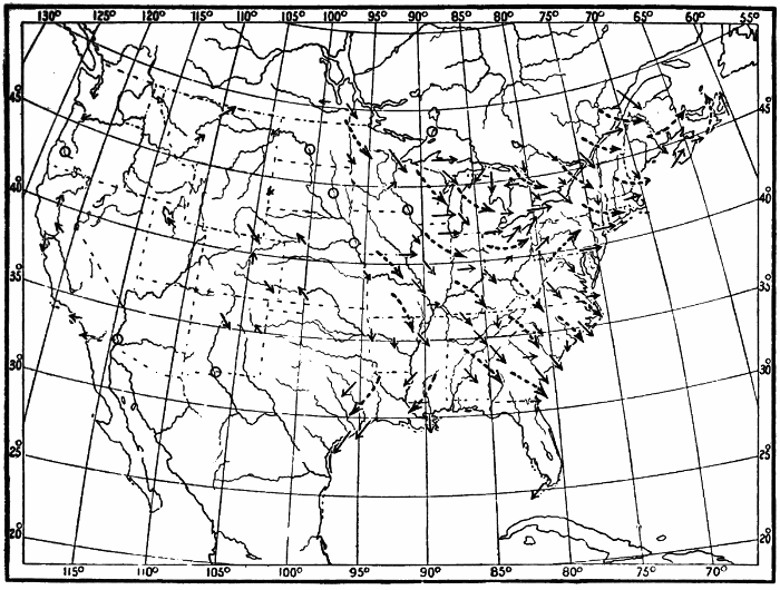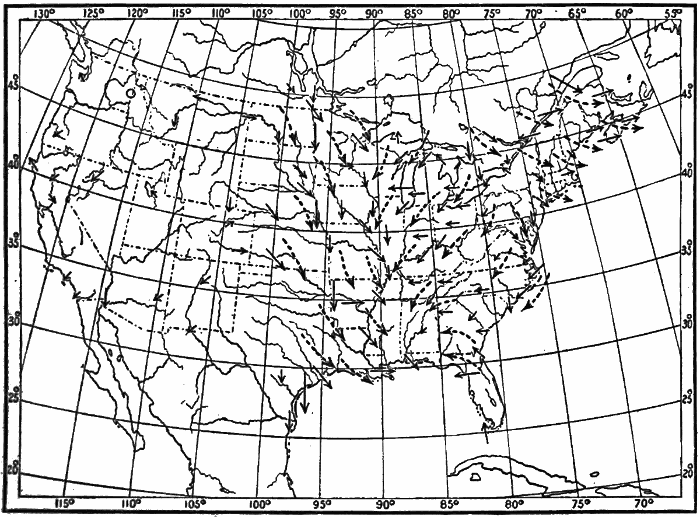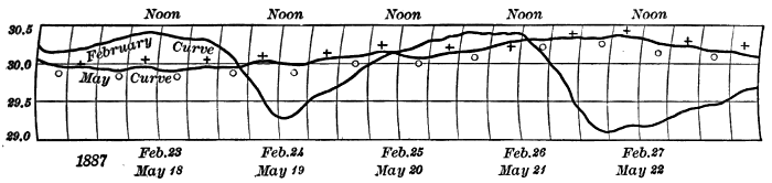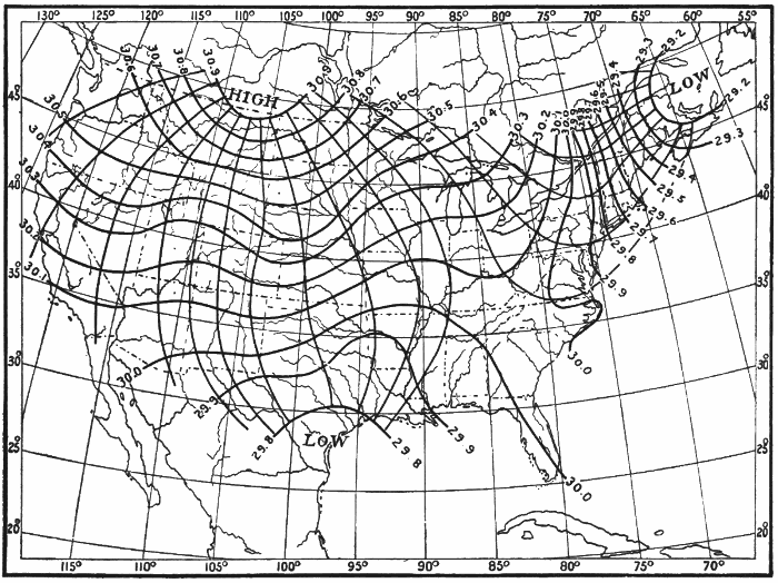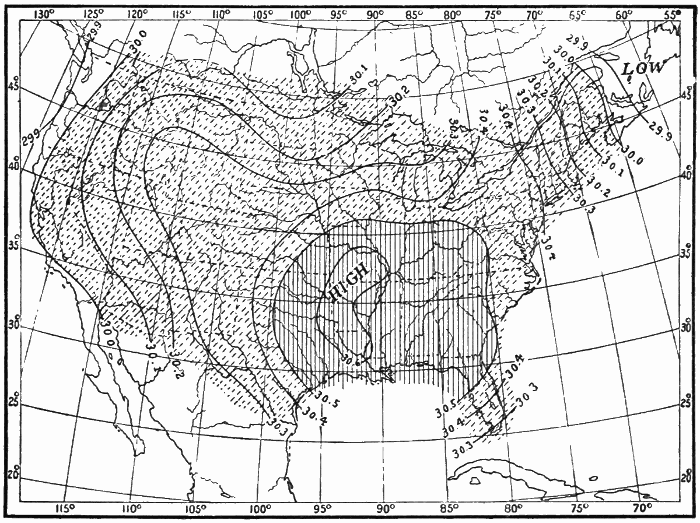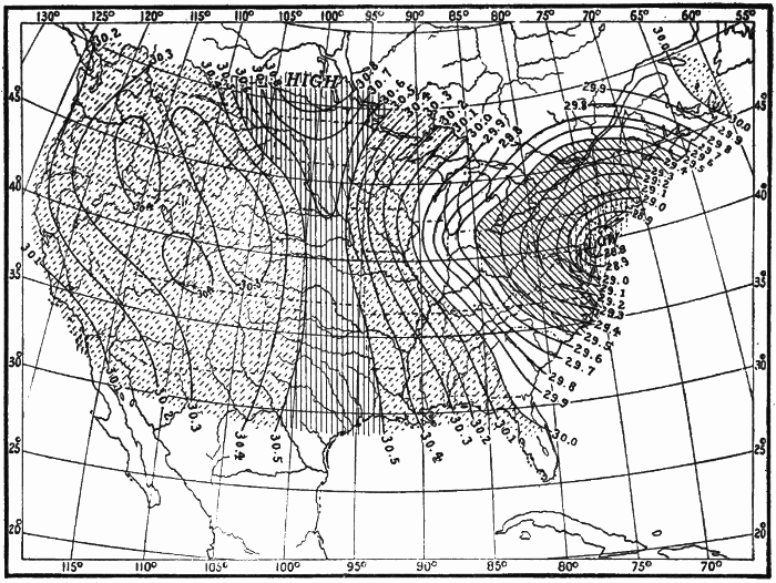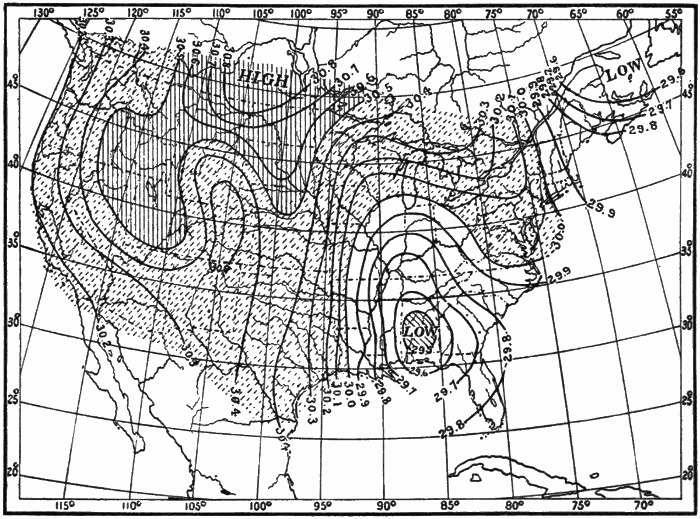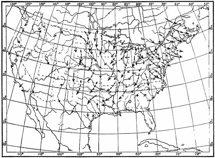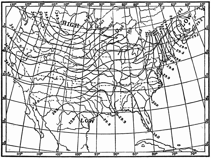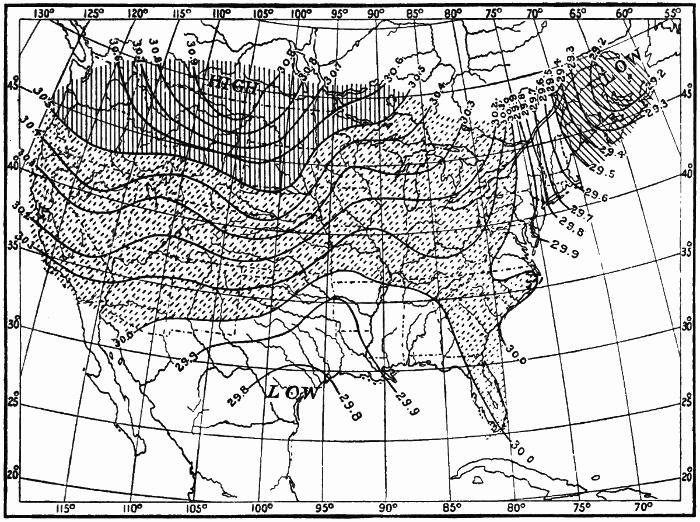 These observations are not made on land only. Hundreds of ship captains on all the oceans of the world are making their regular daily meteorological records, which at the end of the voyage are sent to some central office,[1] where they are studied and employed in the preparation of Pilot Charts for the use of mariners. By means of these ocean meteorological observations, which were first systematized and carried out on a large scale under the direction of Lieutenant Matthew Fontaine Maury (born, 1806; died, 1873), of the United States Navy, it has become possible to lay out the most favorable sailing routes for vessels engaged in commerce in all parts of the world.