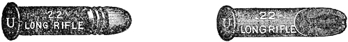 These arms, shown in Figs. 1 and 2, have solid frames, and the actions are almost identical, the cylinder swinging out to the left, on[Pg 22] a hinge, when released by a catch. The shells may then be extracted simultaneously by pushing back the extractor rod. The Smith & Wesson has an additional hinge-locking device in front of the cylinder. The Colt has an automatic safety lock between the hammer and the frame, permitting discharge only when the trigger is pulled. Apart from these features there is very little difference between these arms.