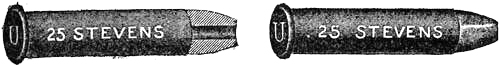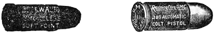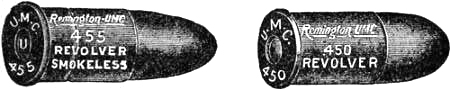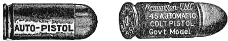 The ineffectiveness of the .38-caliber service revolver charge was frequently complained of by the officers and men serving in the Philippine Islands. This was due to the light powder charge and the conoidal shaped point of the bullet. To remedy this weakness .45-caliber revolvers were issued for the Philippine[Pg 21] service, and a new .45-caliber cartridge designed to which magazine pistol manufacturers were invited to adapt an arm. Unfortunately this new cartridge, which is now the service ammunition, has also a conoidal pointed bullet, is not well proportioned, and consequently develops only a part of its stopping power possibilities.
