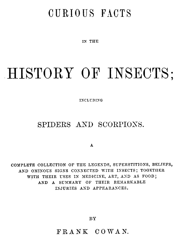 The facts contained in this volume are supposed to be purely historical, or rather not to belong to the natural history of Insects, namely, their anatomy, habits, classification, etc. They have been collected mostly from Chronicles, Histories, Books of Travels, and such like works, which, at first view, seem to be totally foreign to Insects: and were only discovered by examination of the indexes and tables of contents.