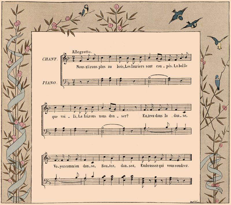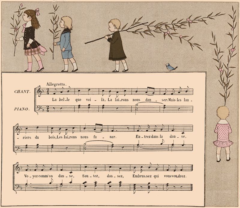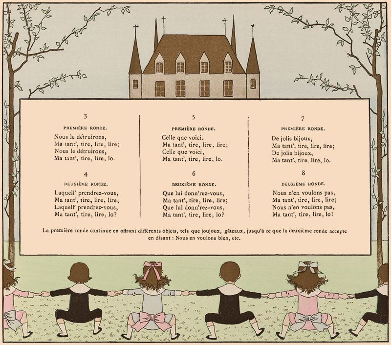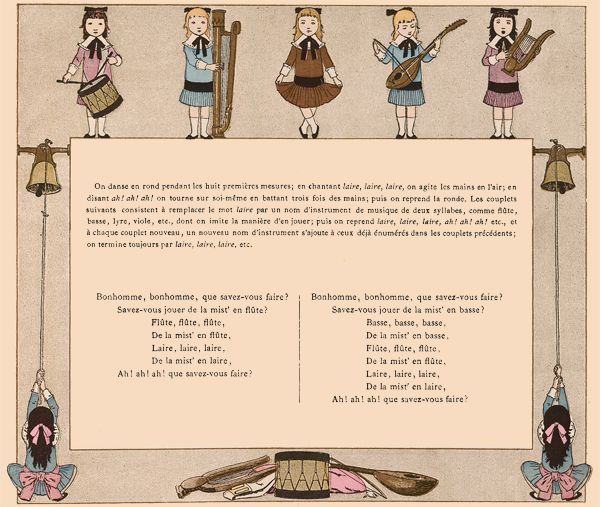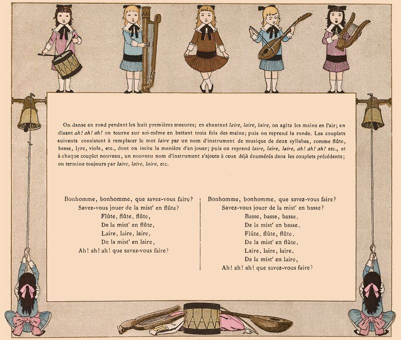 On danse en rond pendant les huit premières mesures; en chantant laire, laire, laire, on agite les mains en l'air; en disant ah! ah! ah! on tourne sur soi-même en battant trois fois des mains; puis on reprend la ronde. Les couplets suivants consistent à remplacer le mot laire par un nom d'instrument de musique de deux syllabes, comme flûte, basse, lyre, viole, etc., dont on imite la manière d'en jouer; puis on reprend laire, laire, laire, ah! ah! ah! etc., et à chaque couplet nouveau, un nouveau nom d'instrument s'ajoute à ceux déjà énumérés dans les couplets précédents; on termine toujours par laire, laire, laire, etc.