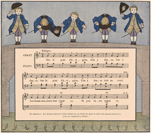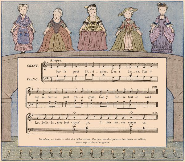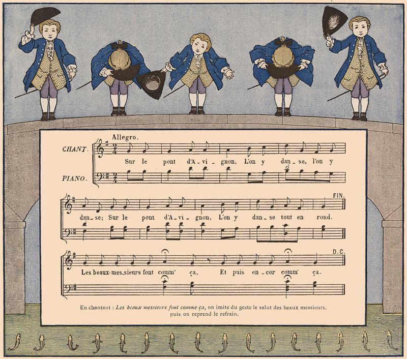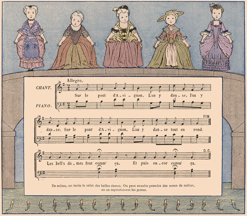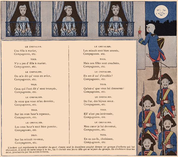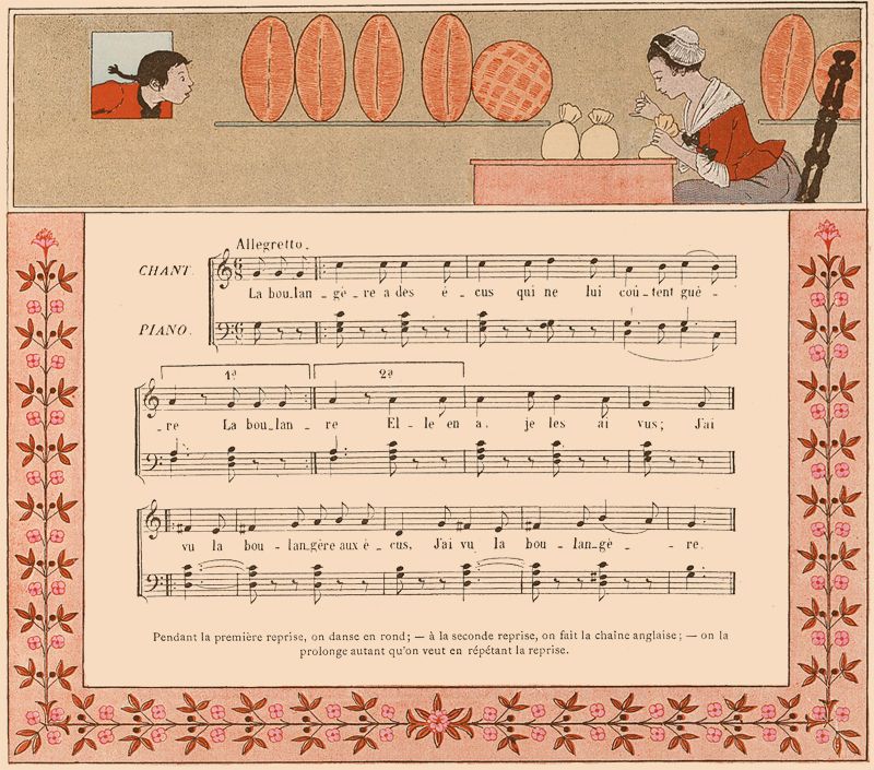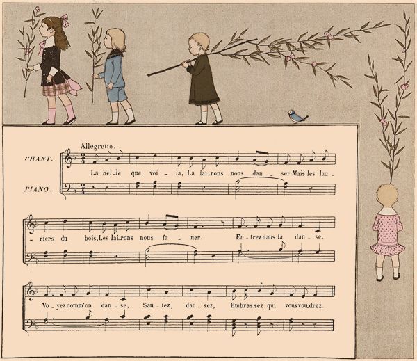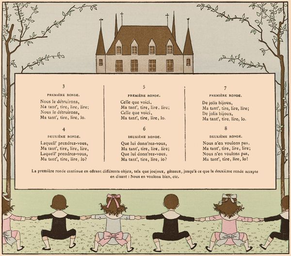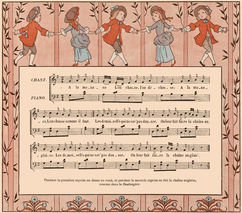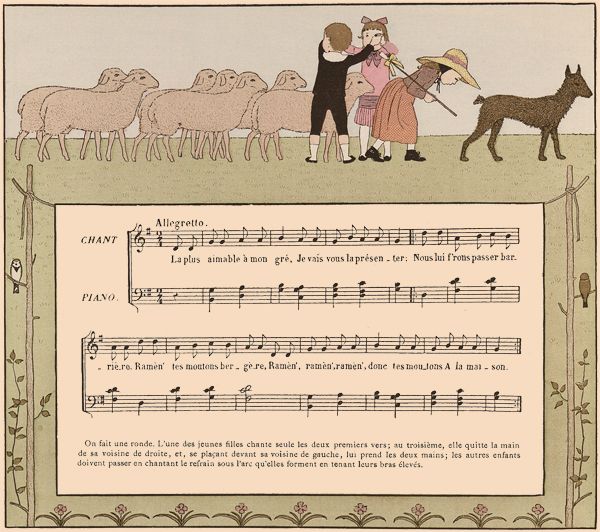 On fait une ronde. L'une des jeunes filles chante seule les deux premiers vers; au troisième, elle quitte la main de sa voisine de droite, et, se plaçant devant sa voisine de gauche, lui prend les deux mains; les autres enfants doivent passer en chantant le refrain sous l'arc qu'elles forment en tenant leurs bras élevés.