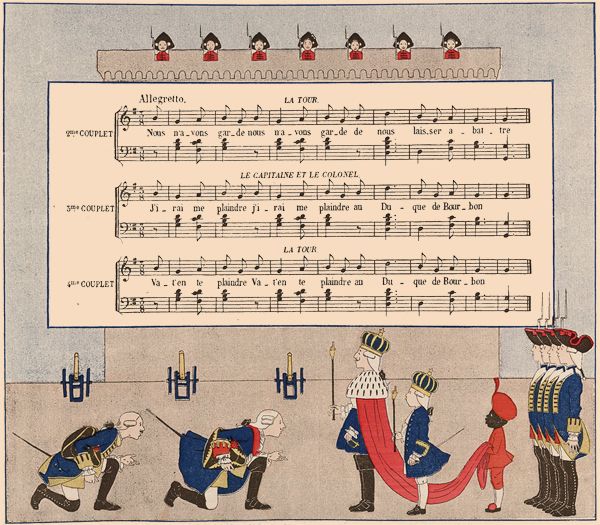 Deux enfants figurent la tour en se tenant par la main.—Le colonel et le capitaine se promènent autour d'eux en chantant. Le duc est assis plus loin, avec son fils à côté de lui; ses gardes l'entourent.