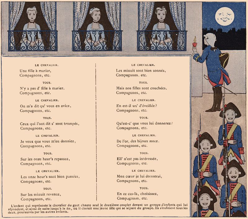 L'enfant qui représente le chevalier du guet chante seul le deuxième couplet devant un groupe d'enfants qui lui répondent, et ainsi de suite jusqu'à la fin, où il choisit une jeune fille qui se sépare du groupe. Ils s'enfuient tous les deux, poursuivis par les autres enfants.