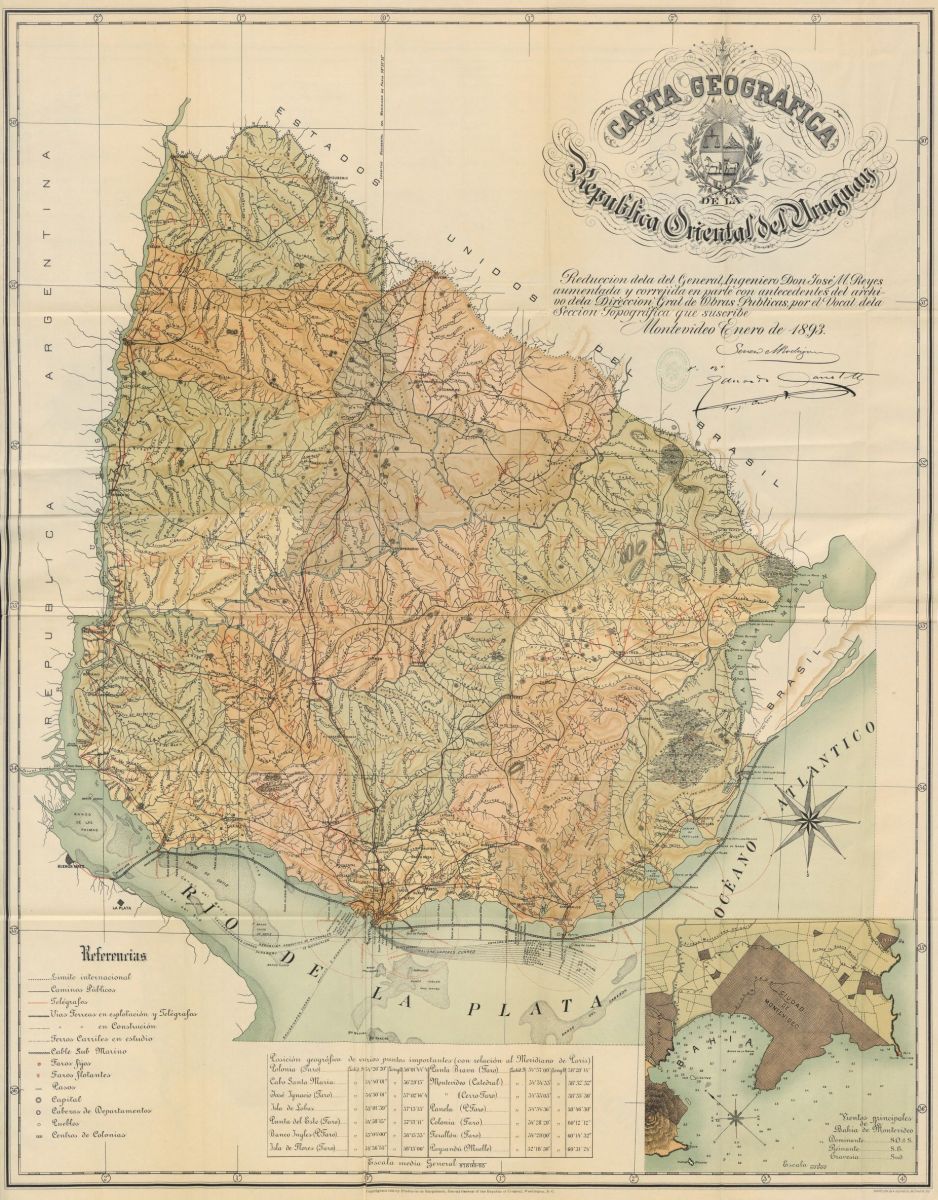 Its geographical situation is comprised between the 30°, 5' and 35° degrees of latitude S. and the 56th 15' and 60th 45' of longitude W., according to the Paris meridian.