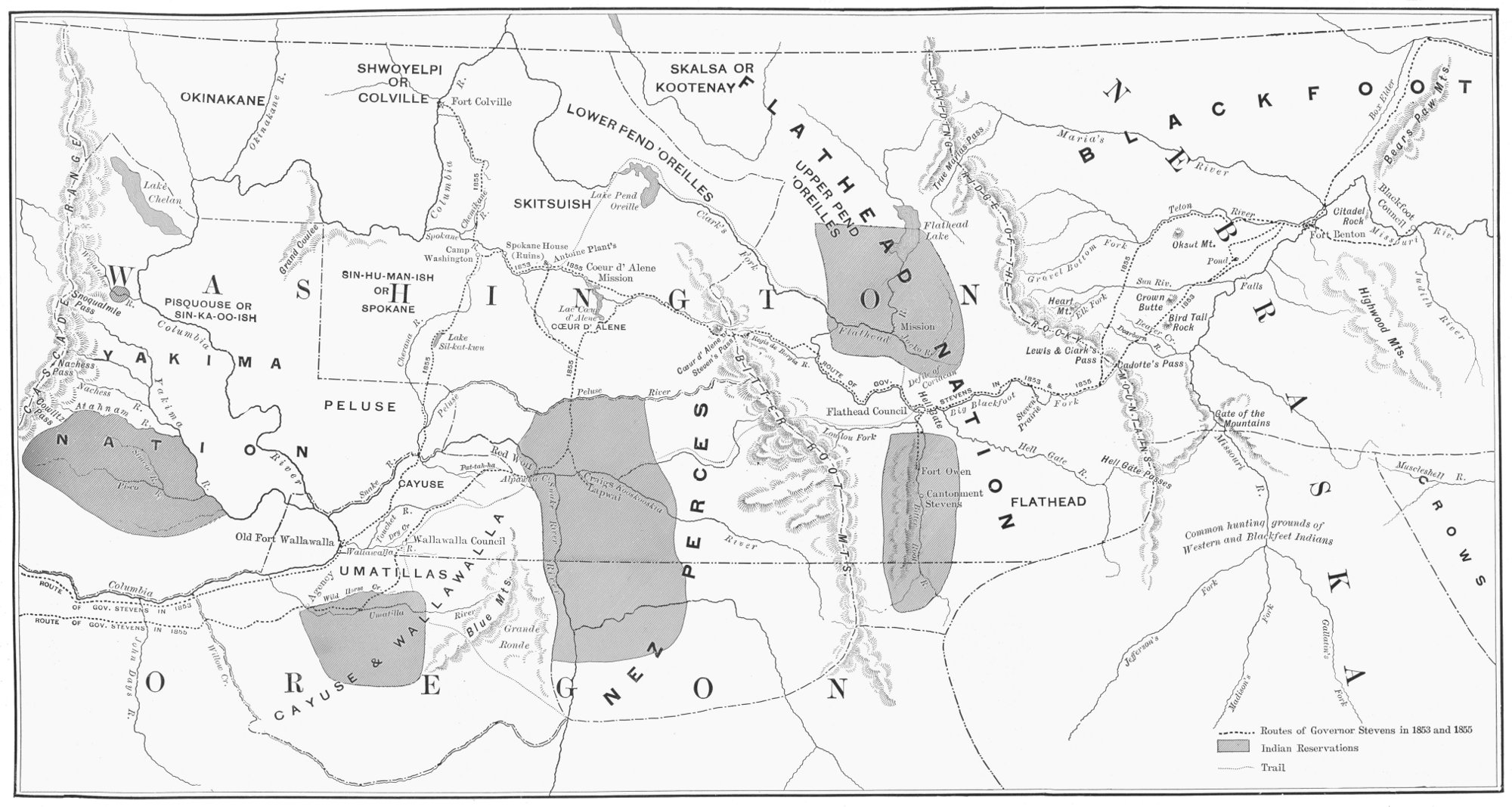 | Chiefs unwilling to unite on one reservation—Alexander dreads strictness of the white man’s rule—Big Canoe—What need of treaty between friends?—Let us live together—Protracted debates—Indians feast and counsel among themselves—No result—Victor leaves the council—Two days’ intermission—Governor Stevens accepts Victor’s proposition and concludes treaty—Moses refuses to sign treaty—“The Blackfeet will get his hair” | 81 |