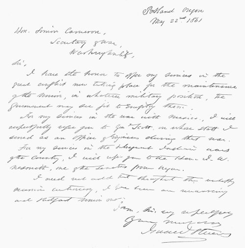 | Governor Stevens returns to Washington Territory—Recommends supporting the government and arming the militia—Elected captain of Puget Sound Rifles of Olympia—Democratic convention meets—Governor Stevens withdraws his name as candidate for delegate—His speech—Offers services—Hastens to Washington—Meets cold reception—Accepts colonelcy of 79th Highlanders—Governors Andrew and Sprague offer regiments | 313 |