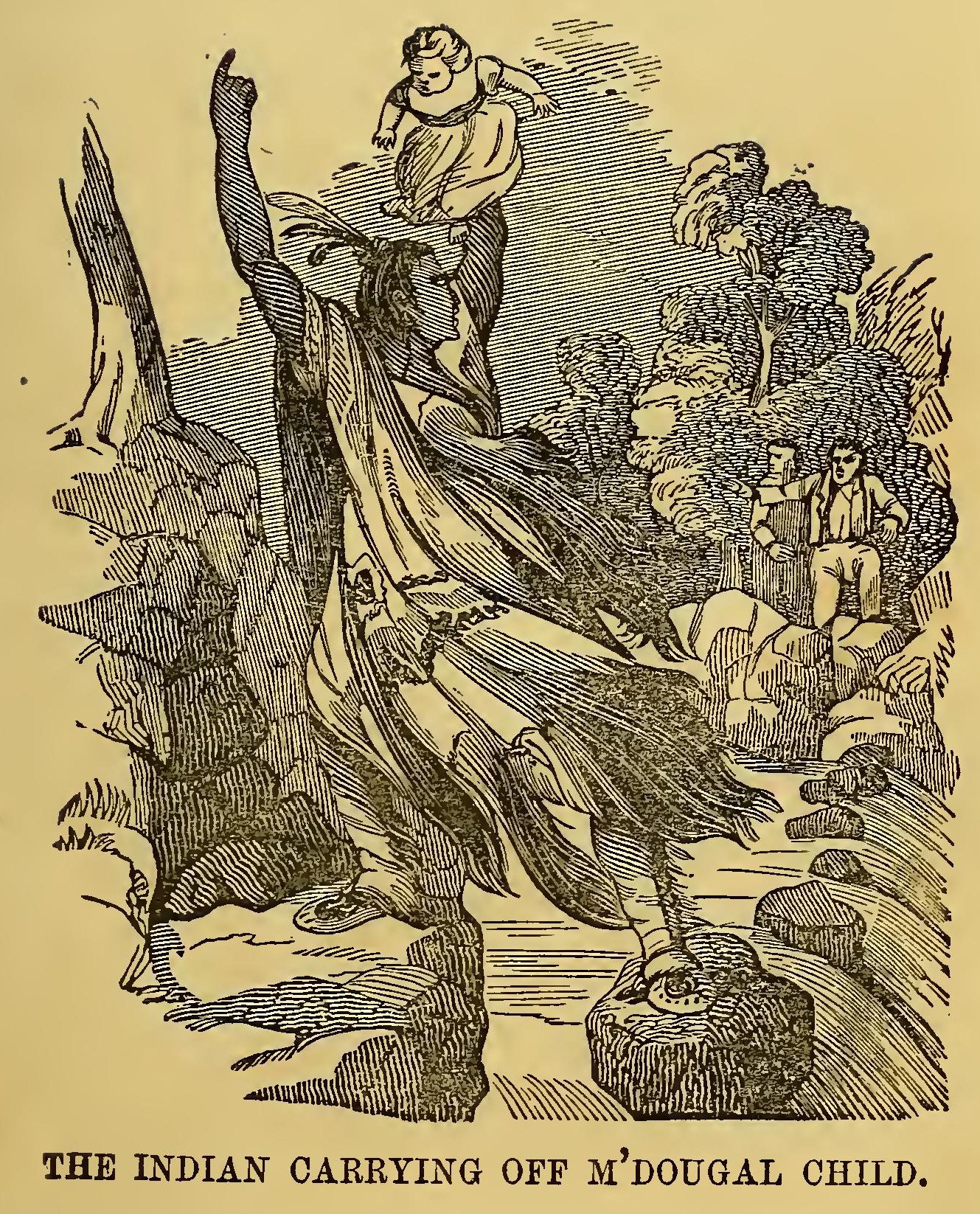 Mrs. M’Dougall had a young child, which the Indian’s quick eye had not failed to notice; and finding that words and gestures would not persuade his Scotch friend, he approached the cradle, seized the child, and darted out of the house with the speed of the antelope. The father and mother instantly followed, calling loudly on him to return; but he had no such intention. He led them on, now slower, now faster, occasionally turning towards them, laughing and holding up the child to their view. After proceeding in this manner for some time, the Indian halted on the margin of a most beautiful prairie, covered with the richest vegetation, and extending over several thousand acres. In a moment after, the child was restored to its parents, who, wondering at such strange proceedings, stood awhile panting for breath. On the other hand, the Indian seemed overjoyed at the success of his manoevre, and never did a human being frisk about and gesticulate with greater animation.