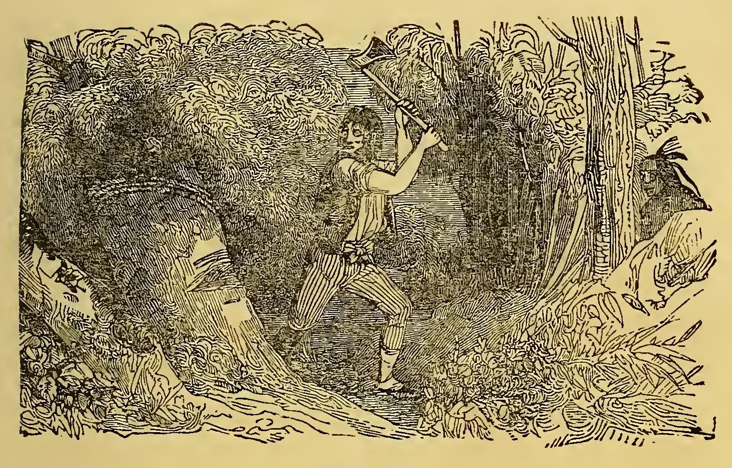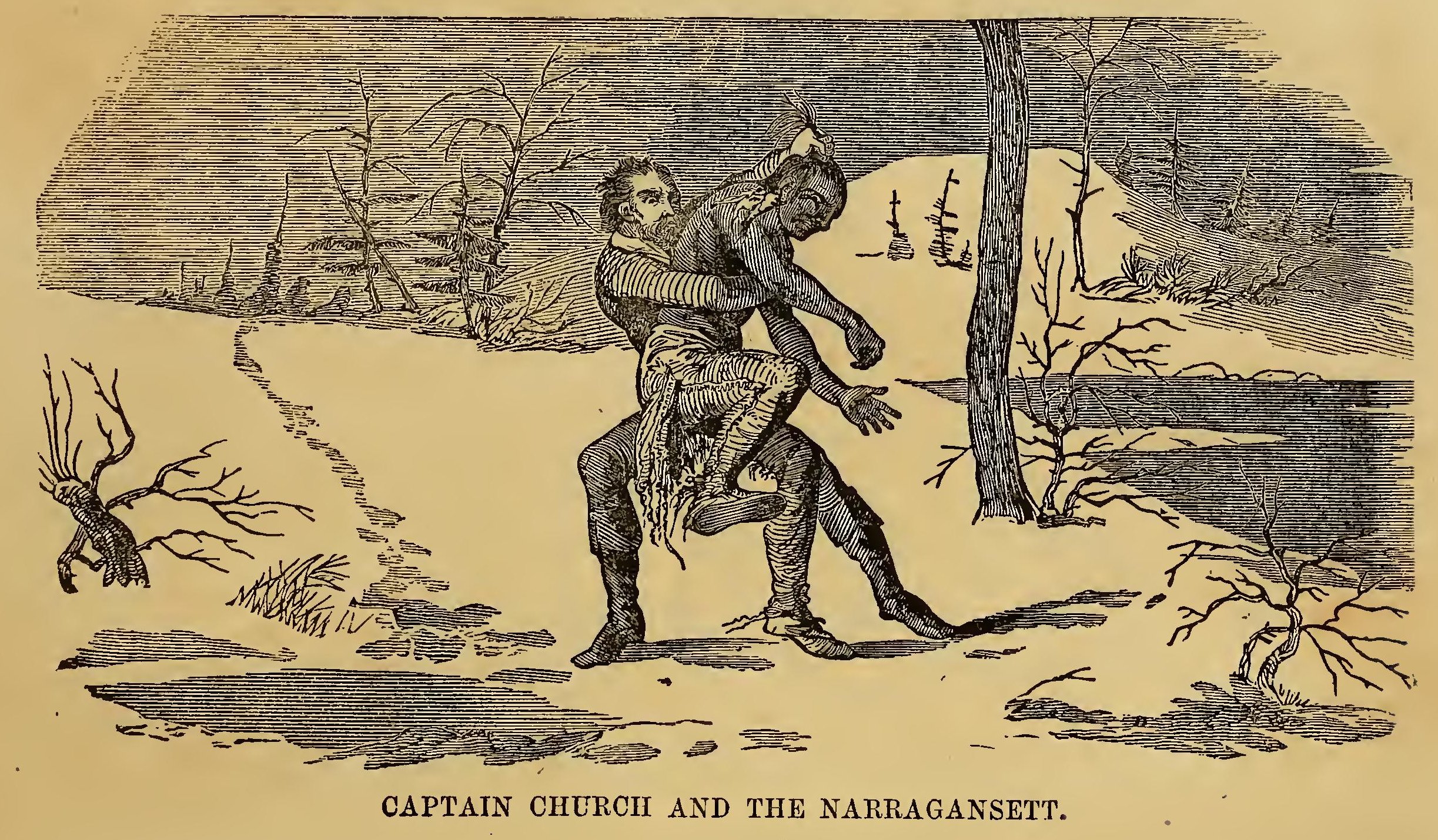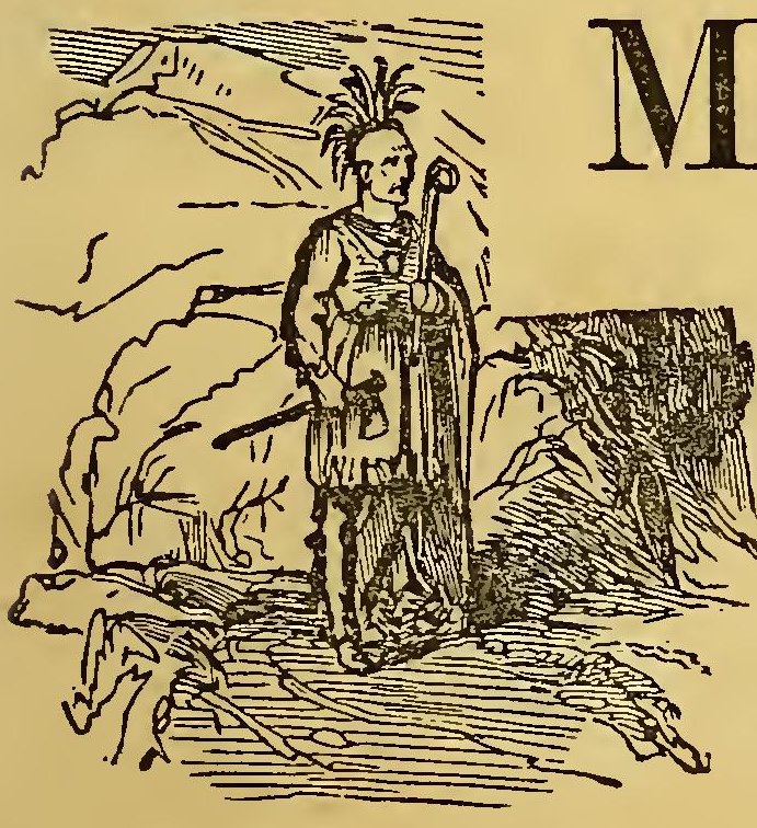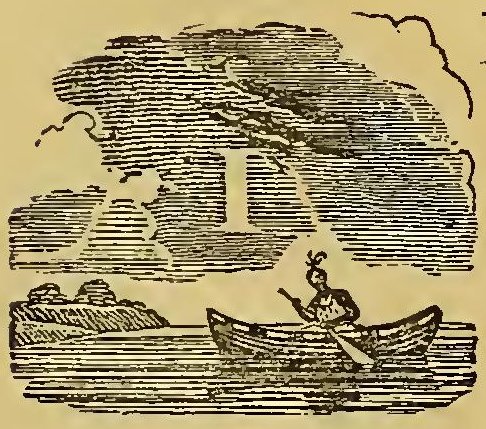 URING the frequent wars between the Indians and the early settlers of New England, the former defeated a party of English soldiers. Their retreat was without order; and a young English officer, in attempting to escape, was pursued by two savages. Finding escape impracticable, and determined to sell his life as dearly as possible, he turned round to face his foes. A violent struggle commenced, and he must have fallen, if an old chief had not thrown himself between the combatants. The red men instantly retired with respect. The old man took the young officer by the hand, dispelled his fears, and led him through the forest to his wigwam, where he treated him with the greatest kindness. He seemed to take pleasure in the youth’s company; he was his constant companion; he taught him his language, customs, and arts. Thoughts of home would sometimes haunt the young Englishman. At these times, Wanou would survey his young friend attentively, and the tears would fill his eyes.