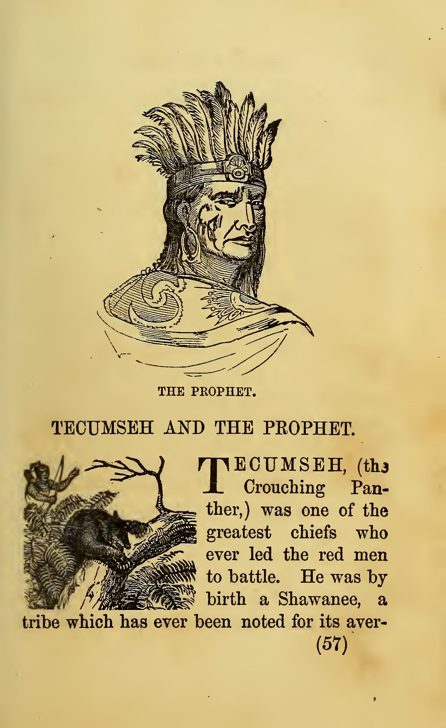 ECUMSEH, (the Crouching Panther,) was one of the greatest chiefs who ever led the red men to battle. He was by birth a Shawanee, a tribe which has ever been noted for its aversion to the whites. He was born about 1770, and first became distinguished in 1792, when, at the head of a small band of warriors, he surprised and murdered a party of whites upon Hacker’s Creek. From that time he continued to acquire a reputation for all the qualities, which, in the estimation of the Indians, make up a great leader.