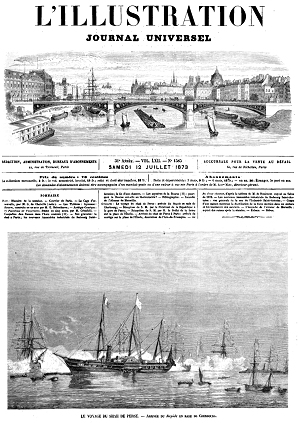 Gravures: Le voyage du shah de Perse: arrivée du Rapide en rade de Cherbourg;--Réception de S. M. par le Président de la République à la gare de Passy;--Réception de S. M. par M. le Préfet de la Seine sur la place de l'Étoile.--Arrivée du shah de Perse à Paris: arrivée du cortège sur la place de l'Étoile, décoration de l'Arc-de-Triomphe,--La fin d'une chanson, d'après le tableau de M. de Beaumont expose au Salon de 1873.--Les nouveaux immeubles industriels du faubourg Saint-Antoine: vue générale de la rue de l'Industrie Saint-Antoine;--Coupe d'une maison montrant la distribution de la force motrice dans les ateliers et les logements des ouvriers.--L'incendie de l'Alcazar de Marseille: aspect des ruines après le sinistre.--Rébus. |
