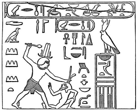 (The oldest inscription in the world, probably 6000 years old. The king conquering an Arabian or Asiatic enemy.)