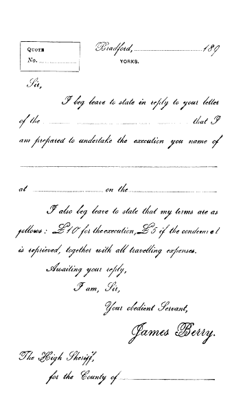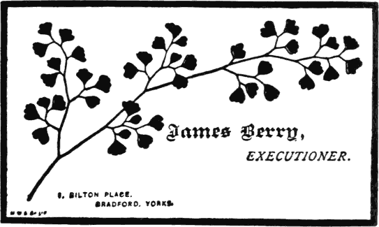 The “executioner’s office,” as Mr. Berry likes to call it on his official communications, is a house just off City Road, Bradford. It is one of six owned by Mr. Berry. When he first took the position of executioner some of his neighbours were so prejudiced against the work, that they refused to live “next door to a hangman,” and as landlords naturally object to losing two or three tenants for the sake of keeping one, Mr. Berry was obliged to move once or twice, and came to the conclusion that he had better be his own landlord. The prejudice which then existed has been lived down, and there is now no difficulty in letting neighbouring houses to respectable tenants.