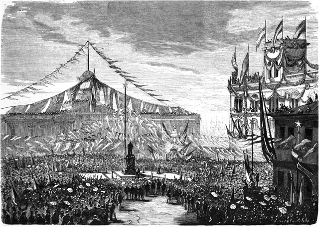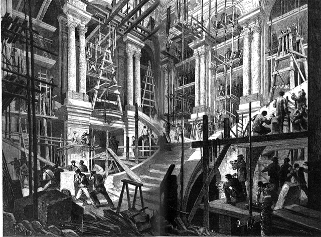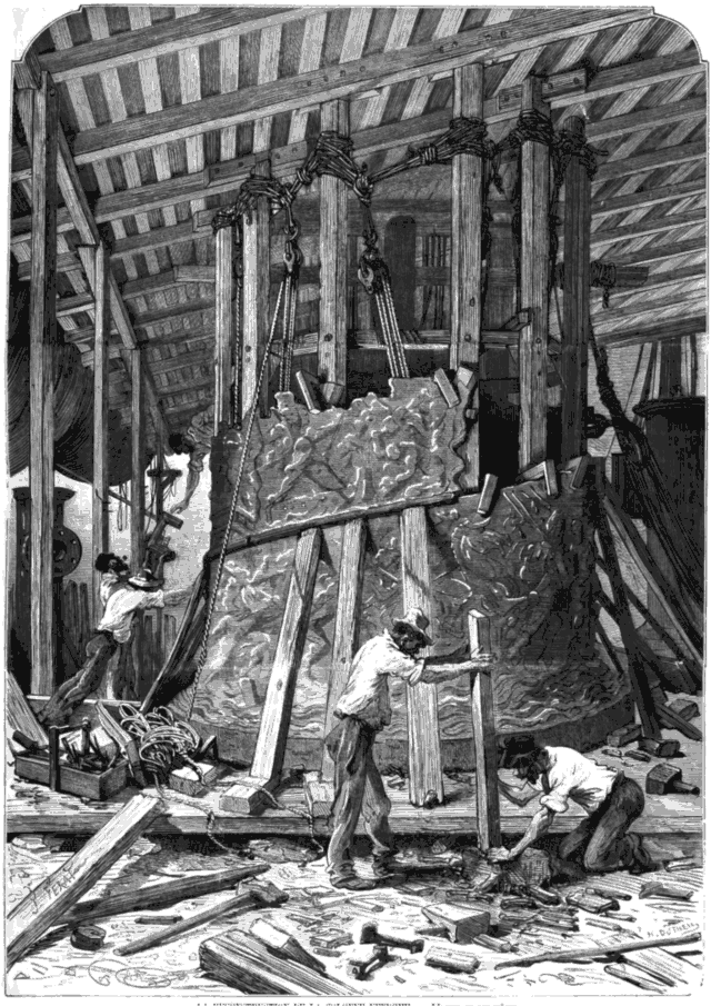 Redressage des pièces de la colonne dans l'usine de MM. Monduit et Béchet; L'ajustage des pièces.--Le nouvel Opéra: état actuel des travaux dans l'escalier d'honneur.--Marché à Anvers (dix-huitième siècle), d'après le tableau de M. Hugo Salmson.--L'évacuation: entrée des troupes françaises à Pont-à-Mousson.--Valparaiso: inauguration de La statue de lord Cochrane.--L'ouragan du 9 août à Nîmes.--Rébus.