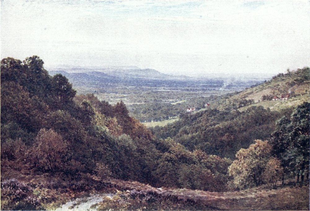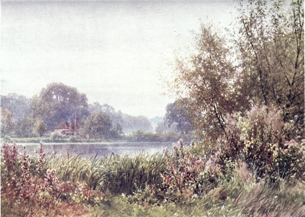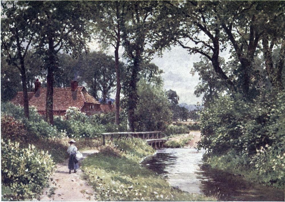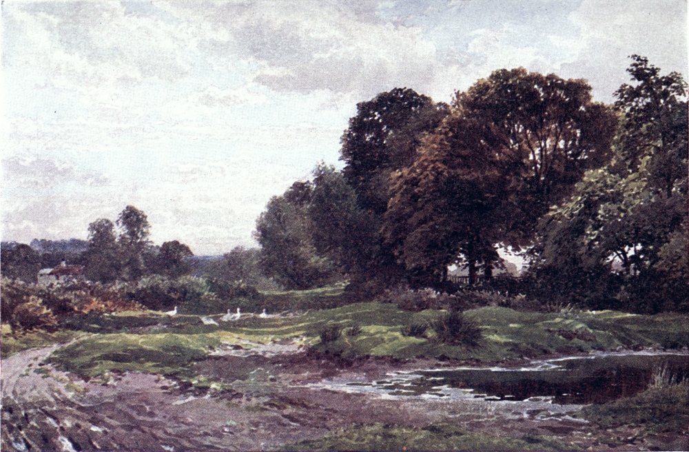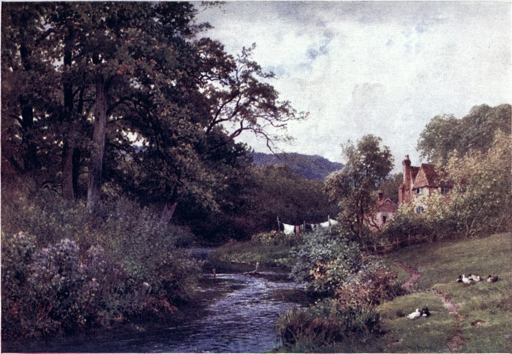 Some brooklets of the Weald run southward to the English Channel, else, nearly the whole of Surrey drains into the valley of the Thames, a river to make the landscape fortune of any county. If ever its scenes have a fault, from the artist’s point of view, this may appear to be the absence of water; yet some of its noblest prospects are where the Mole and the Wey break through the sand or chalk ridges to reach the river plain. Surrey has smaller streams less widely known. Ruskin, to deaf ears, lamented the defilement of the Wandle, its source, its curving course, and its mouth all now within the limits of Greater London. Do Putney boys trace to its head the Beverley Brook, as Charles Lamb’s companions tried to play{8} explorer up the New River? How many of the most schooled Londoners could tell through what parishes and by what suburban settlements flows the Hogsmill River, or the Bourne, or the Burway Ditch? A Brixton householder may hear the name of the Ephra without guessing how its course is below his feet. There are veteran ramblers in Surrey who know not the Deanoak Brook, nor the Blackwater. The motorist scorching along the Tillingbourne Valley road comes home ignorant what beautiful banks he has skirted, while one goggled eye was all upon his gear, and the other on the look-out for police traps.