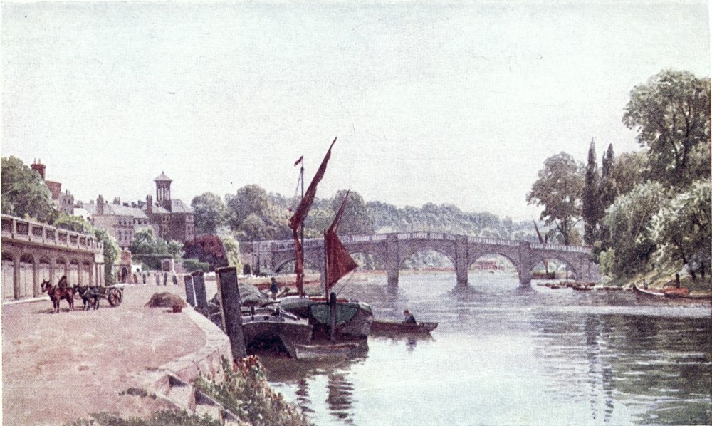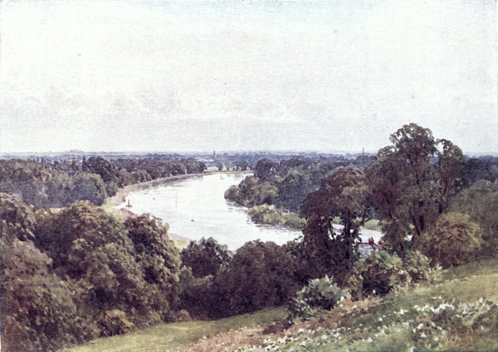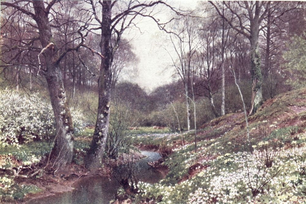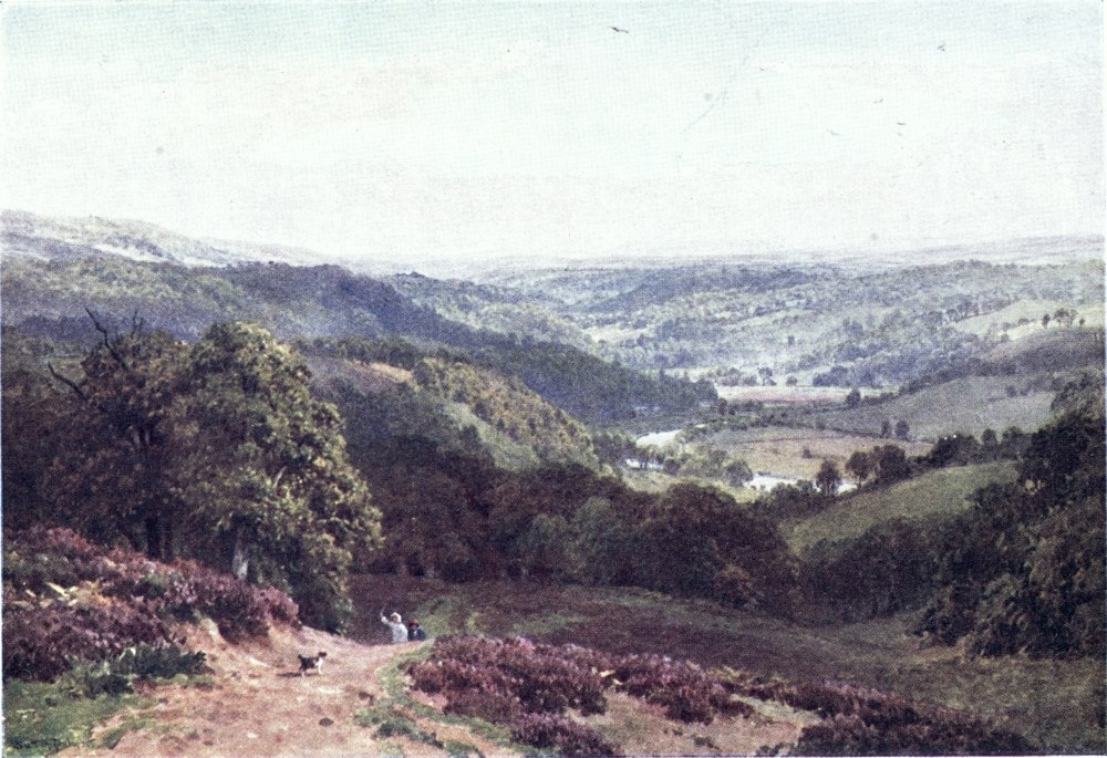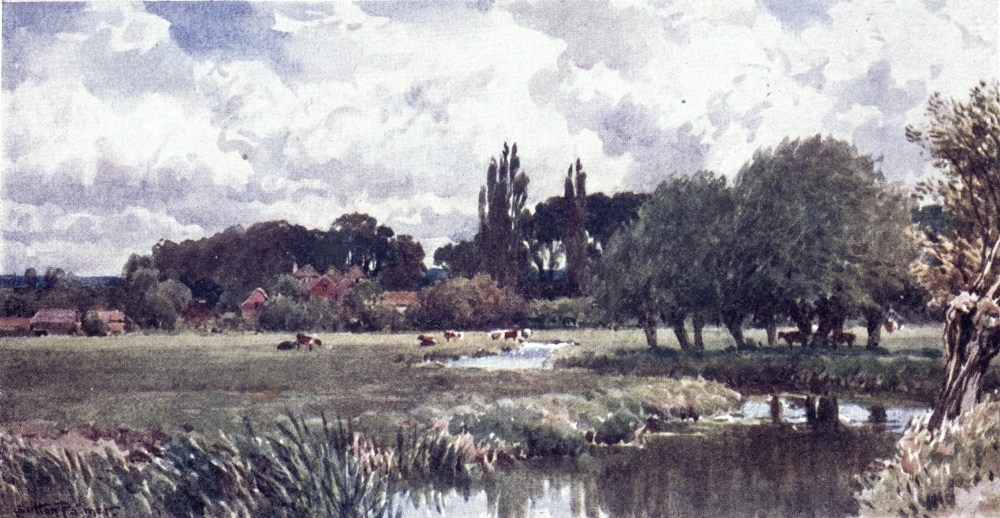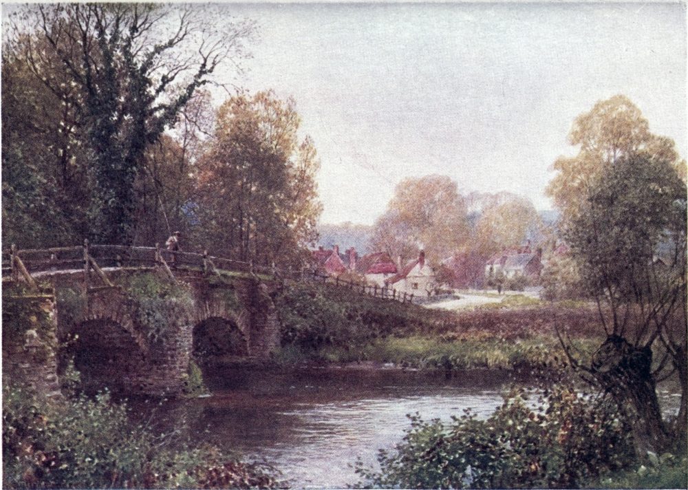 Some brooklets of the Weald run southward to the English Channel, else, nearly the whole of Surrey drains into the valley of the Thames, a river to make the landscape fortune of any county. If ever its scenes have a fault, from the artist’s point of view, this may appear to be the absence of water; yet some of its noblest prospects are where the Mole and the Wey break through the sand or chalk ridges to reach the river plain. Surrey has smaller streams less widely known. Ruskin, to deaf ears, lamented the defilement of the Wandle, its source, its curving course, and its mouth all now within the limits of Greater London. Do Putney boys trace to its head the Beverley Brook, as Charles Lamb’s companions tried to play{8} explorer up the New River? How many of the most schooled Londoners could tell through what parishes and by what suburban settlements flows the Hogsmill River, or the Bourne, or the Burway Ditch? A Brixton householder may hear the name of the Ephra without guessing how its course is below his feet. There are veteran ramblers in Surrey who know not the Deanoak Brook, nor the Blackwater. The motorist scorching along the Tillingbourne Valley road comes home ignorant what beautiful banks he has skirted, while one goggled eye was all upon his gear, and the other on the look-out for police traps.