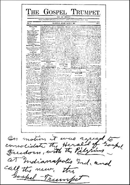 Consolidation of Herald of Gospel Freedom with the Pilgrim, forming the Gospel Trumpet—Rome City its birthplace—Move to Indianapolis—Difficulties and privations—Paper issued irregularly—Printed on hand-press—Move to Cardington, Ohio, and later to Bucyrus—To Williamston, Mich., in 1884, and to Grand Junction in 1886—Substantial progress.