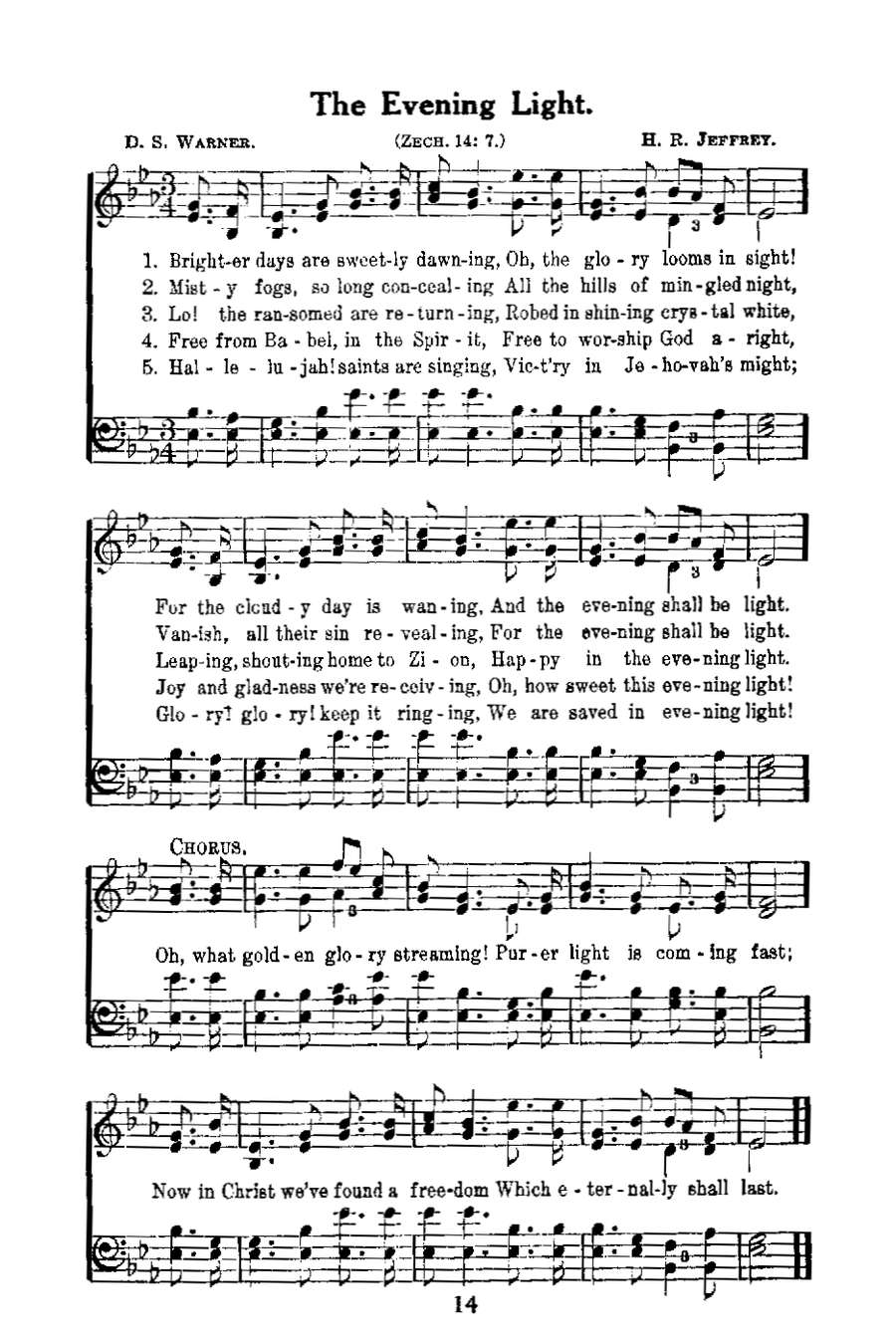 Bro. Warner and his associates, discerning the impossibility of the true church existing within the framework of denominationalism, declared their freedom from the "sin of sectism and division" and instituted the "evening light" restoration movement in the latter part of the nineteenth century in direct fulfillment of Bible prophecy. See Zech. 14:7. These vital Bible truths, especially on the line of holiness and the nature of the church, which those reformers proclaimed, are imperative today in preserving the church after the apostolic pattern.