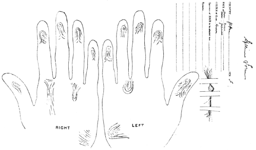 As Sir Francis began to give attention to this subject in 1888 (p. 2 of work just quoted) it is only justice to myself in the matter to state that in June, 1886, I called on the then librarian of the Royal College and impressed upon him my conviction that as nothing had then been known of any printed work by Purkinje on this topic, a search among his remaining papers should be made, as to me it seemed improbable that, working so closely in that field, Purkinje could fail to observe the patterns of the finger-furrows. It seemed as certain a deduction to me as was that of the existence of Neptune before that planet had been actually discovered. The pamphlet is in Latin, a work of 58 pages, printed at Vratislav, (i.e., Breslau) in 1823. In the article on “Finger-Prints,” in the Encyclopædia Britannica (1911) it is stated that “the permanent character of the finger-print was put forward scientifically in 1823 by J. E. Purkinje, an eminent professor of physiology, who read a paper before the university of Breslau,” etc. But he was surely not a professor when graduating, and what passage in that thesis, may I ask, deals scientifically with the permanent character of the finger-print? Purkinje had studied the lineations of monkeys as well as those of men.
