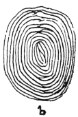 As a student I was fairly well acquainted with much of what that keen observer had written, and when I was lecturing to medical students in Japan on the Testimony of the Senses, I could not help noticing that while Purkinje had been busy with the fingers and with the special development in their sensitive tips of the organs of touch, no records had been preserved which mentioned his notice of the finger-furrows or the patterns made by them. I took much trouble in the matter, writing to eminent authorities and to librarians, and found no trace of any such work. Sir F. Galton, in his published writings, is quite in accord with me so far, but he has not explained how he came to think of Purkinje’s work. Writing in 1892 on Finger-Prints, (p. 85) he says of the subsequent discovery of a thesis of 58 pages: “No copy of the pamphlet existed in any public medical library in England, nor in any private one, so far as I could learn; neither could I get a sight of it at some important Continental libraries. One copy was known of it in America.” The American copy was not known generally till I had made vigorous enquiries there. Sir F. Galton adds, “The very zealous librarian of the Royal College of Surgeons was so good as to take much pains at my instance to procure one: his zeal was happily and unexpectedly rewarded by success, and the copy is now securely lodged in the library of the college.”