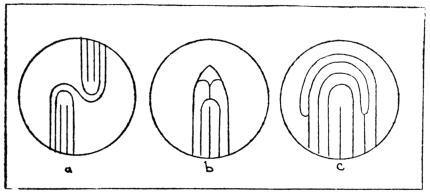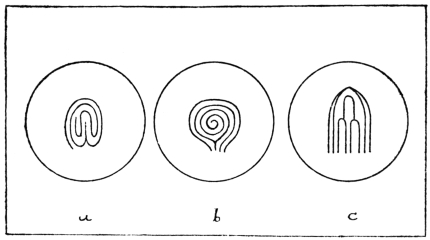 My own attention was first directed to the patterns in finger-prints, as they occurred impressed on sun-baked pottery which I found in the numerous shell-heaps dotted around the great Bay of Yedo. The subject was quite unknown to me till then, in the seventies. No pottery has yet been found which belongs to the early stone stage of man’s culture. But with evidence of the use of fire, and of the manufacture of polished stone weapons, fragments of rude hand-moulded pottery—sun-baked or fire-burned—begin to be associated. Sometimes these are quite clearly seen to be moulded with the aid of human fingers, the nails only making a clear mark, but in other cases the finger furrows are prominently indented in regular patterns, which cannot, I think, be distinguished from those made by men of our own race and time. In the formal Japanese ceremony of social tea-drinking, or Cha-no-yu, pottery of this Archaic kind, with finger patterns indented in the clay, is highly esteemed. In an article on this kind of pottery by Mr. Charles Holme, in The Studio (February, 1909), one example is described thus: “It is modelled in a brown clay entirely by hand, without the aid of a potter’s wheel. The impressions of the fingers made in shaping the bowl are carefully retained,” etc. Not till Celtic times in Europe is there evidence of the use of the potter’s wheel.