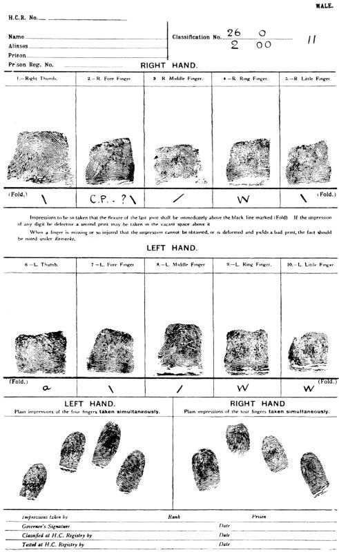 Every now and again I receive letters telling me of some one who thinks he remembers some one saying that he saw, etc., etc. Now, surely, it would not be difficult if anyone were to find such evidence, to send a copy or photograph duly authenticated, and a date attested subsequent to the date of publication by Nature, in 1880, of the correspondence on this subject. A good deal has been written about Professor J. E. Purkenje (or Purkinje) in this connection. One enthusiastic fellow-countryman has mentioned with eulogy a purely imaginary course of lectures on Identification by Finger-Prints. Purkinje does not seem ever to have dreamed of putting them to such a use. In The Daily News of January 23rd, 1911, an interview is reported with Sir Edward Henry, who is made to state that Purkinje “wrote about the value of finger-prints for purposes of identification”; but on enquiry Sir Edward assured me he had not said anything beyond what was stated in his work on Finger-Prints, and in that work, of course, no such statement is hinted at as that Purkinje proposed to secure identification by finger-prints.