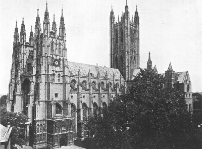 Canterbury Cathedral, the third church erected on the same site, represents English architectural history from 1070 to 1495; but its general external appearance is that of a magnificent building in the Perpendicular style. The present structure was begun by Laufranc, the first Norman architect, and was finished in 1130. The choir of this Norman cathedral was burned in 1174, and the present choir, in the Transitional style from Norman to Early English, was erected by William of Sens (who may almost be said to have introduced the Pointed style into England), and by his successor, William the Englishman (1174-1180). The old Norman nave and transepts remained intact for two hundred years more, when in 1378-1410 they were replaced by the present Perpendicular structure. The great central tower was added in 1495. The northwest tower is modern, the older tower having been pulled down, with doubtful wisdom, to make room for one to match its southwest neighbor. In spite of its huge proportions the interior of the nave produces a wonderful effect of lightness. The choir, one hundred and twenty feet long, is the longest in England. The great Norman arches, supported by circular and octagonal piers alternately, furnish a striking contrast to the inner portions of the nave.