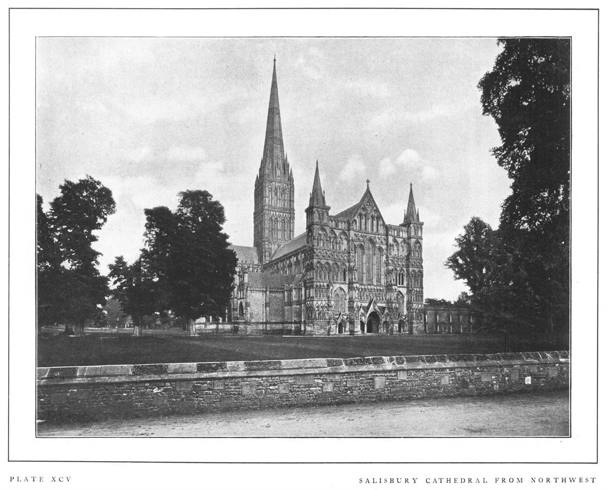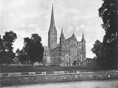 Salisbury Cathedral is a splendid example of pure Early English, having had the rare advantage of having been begun and finished within a period of forty years, 1220-1260, and is remarkable for the uniformity and harmony of its construction. Mr. Ferguson has pointed out that there is scarcely a trace of foreign influence in the building, the square east end taking the place of the apse of the Norman churches, and fixing the future character of English choirs; and he adds that it is "one of the best proportioned and at the same time most poetic designs of the middle ages." The various parts of the building all unite to lead the eye to the central point,—the richly adorned spire built in 1250, which is the loftiest in England. The sculptures on the beautiful west front were nearly all destroyed by the Puritans, but have recently been replaced.