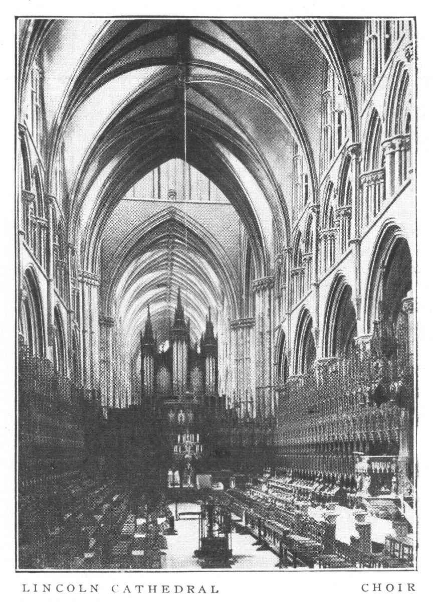 Lincoln Cathedral, splendidly crowning the hill on which the city is built, may perhaps claim to be the finest church in Great Britain. Other cathedrals equal or surpass it in certain points; but in the combination of size, delicacy of detail, effectiveness of both interior and exterior, good preservation and grandeur of position, it has probably no rival. Of the original cathedral, built at the end of the eleventh century, the tower, a portion of the west front, and part of first bay of the nave remain. The Norman cathedral was injured by an earthquake in 1185, and its restoration was at once undertaken by Bishop Hugh, called "St. Hugh of Lincoln" (1186-1200), who finished the choir and east transepts—the earliest piece of Early English work of known date. The west transepts and chapter-house were completed soon after, and the nave, including the west front, by about 1250. The upper story of the central tower, which dates from about 1240-50, was added between 1300 and 1320. The upper parts of the west towers are late Decorated, dating from about 1380. Among the more noteworthy external features are the fine central and west towers, and the west façade, in spite of its mixture of styles and the fact that it is in some degree merely a screen. The choir of the interior is the oldest known example of the Early English style, and is separated from the nave by a decorated screen (1320) surmounted by the organ. Though the vaulting is too low the entire interior is harmonious and imposing.