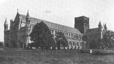 St. Albans Abbey, which was raised to the dignity of a cathedral in 1877, is one of the finest and largest churches in England. The earliest parts of the existing building date from the eleventh century; the choir was built in the thirteenth, and the Lady-Chapel in the fourteenth. The fine tower is Norman. An extensive, and not especially successful, restoration of the buildings including a new Early English west front with a large decorated window, has recently been completed.