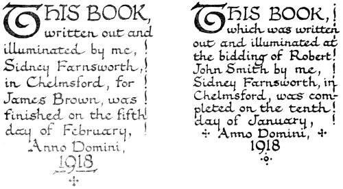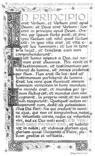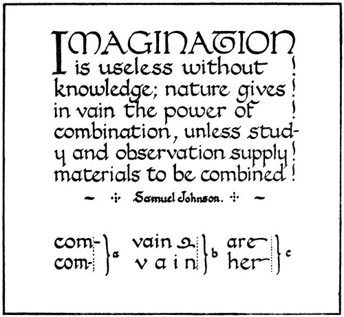 “Perfect illumination,” says Ruskin, in one of his Lectures on Art, “is only writing made lovely;... But to make writing itself beautiful—to make the sweep of the pen lovely—is the true art of illumination.” Certainly it is only when the student is able to produce writing that is attractive in itself, that it is permissible to add decoration to it. The decoration should be the natural outgrowth from the writing.