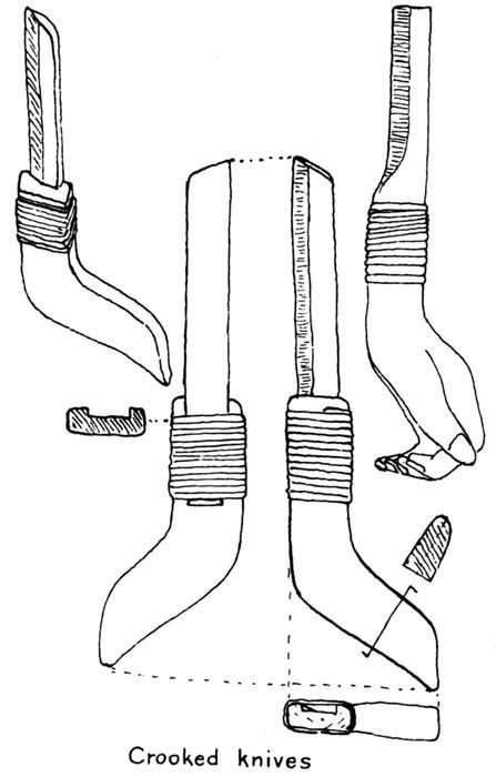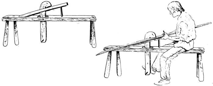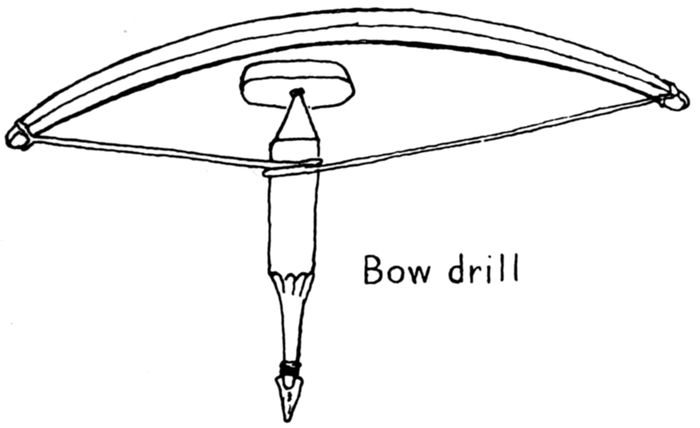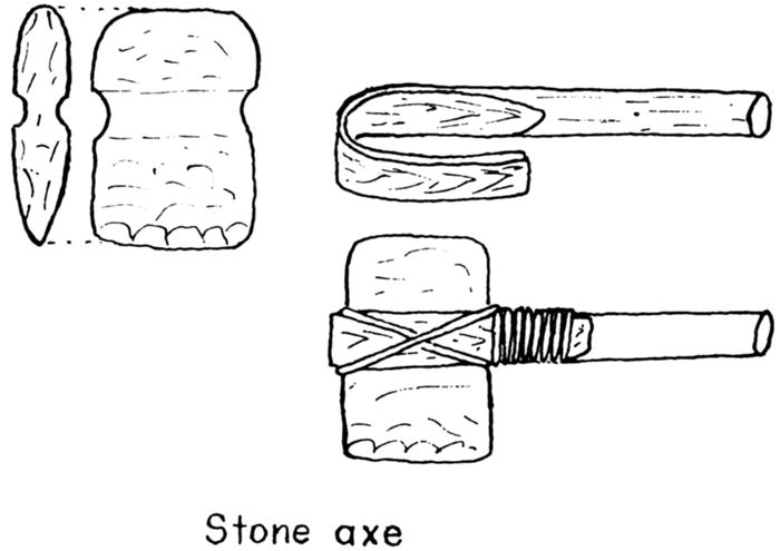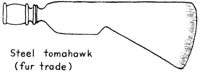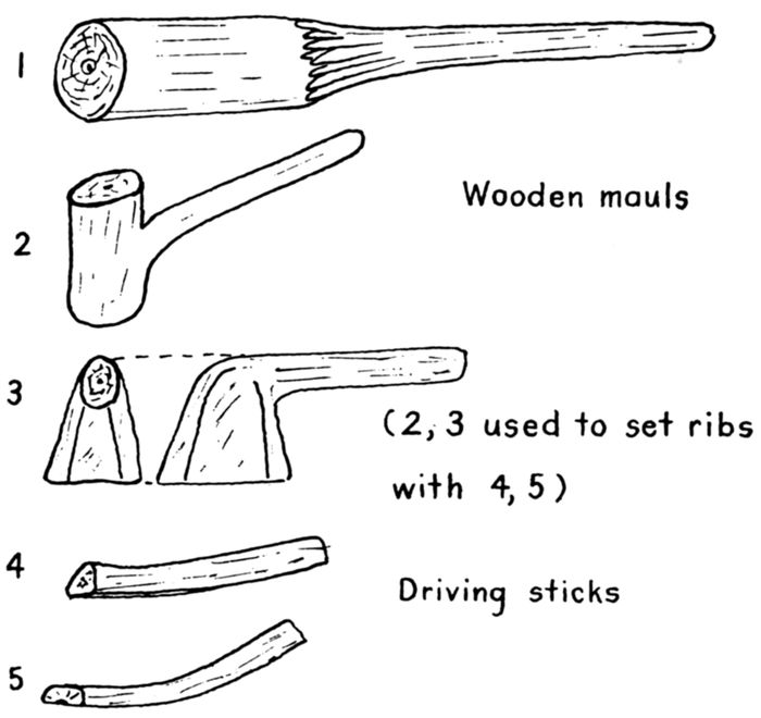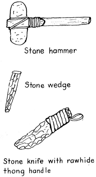 | 8-19 | Sketches of tools: 8, stone axe; 9, stone hammer, wedge, and knife; 10, mauls and driving sticks; 11, stone scraper; 12, bow drill; 13, modern Hudson Bay axe; 14, steel fur-trade tomahawk; 15, steel canoe awls; 16, crooked knives; 17, froe; 18, shaving horse; 19, bucksaw. | 17 |