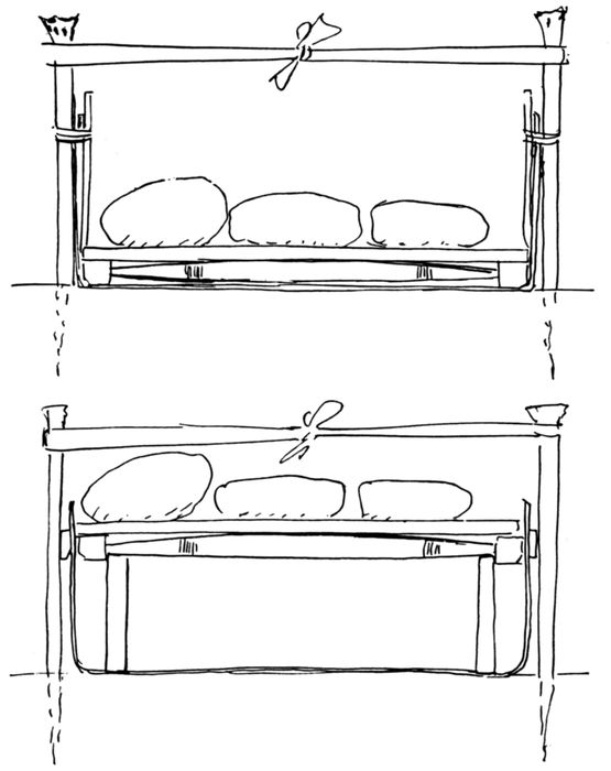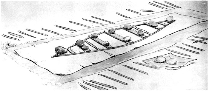 | 33 | First stage of canoe construction: assembled gunwale frame is used to locate stakes temporarily on building bed. (Sketch by Adney.) | 40 |