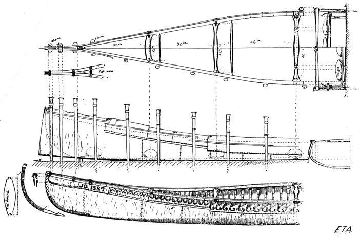 | 40 | Sketch: Multiple cross section through one side of a canoe on the building bed, at the headboard, middle, first, and second thwarts. | 46 |