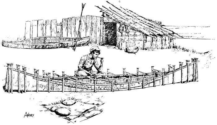 | 41 | Fourth stage of canoe construction: bark cover has been shaped and all stakes placed. (Sketch by Adney.) | 47 |