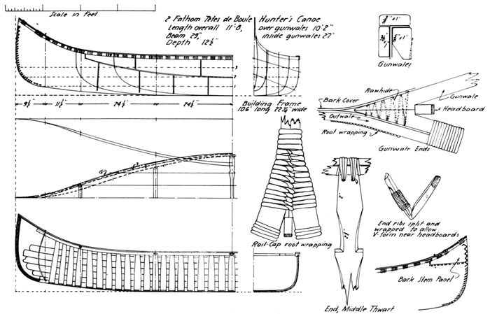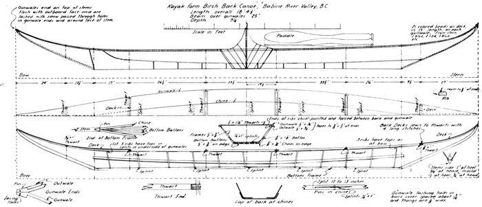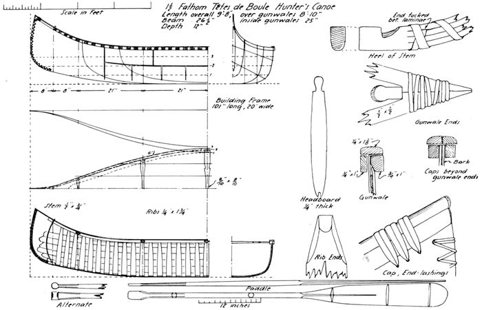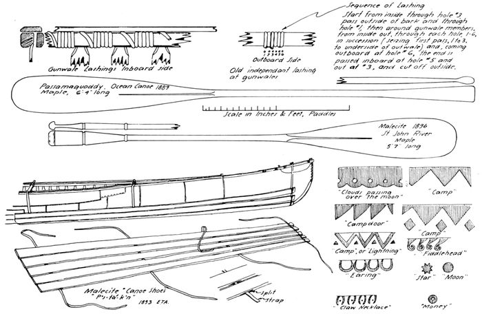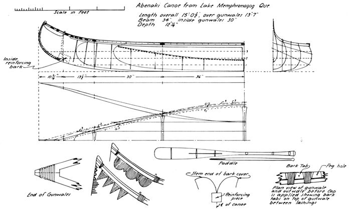 Hadlock, Wendell S. and Dodge, Ernest S. A canoe from the Penobscot River. American Neptune (October 1948), vol. 8, no. 4, pp. 289-301. (Detailed description of early birch-bark canoe, with lines and numerous drawings of construction details.)