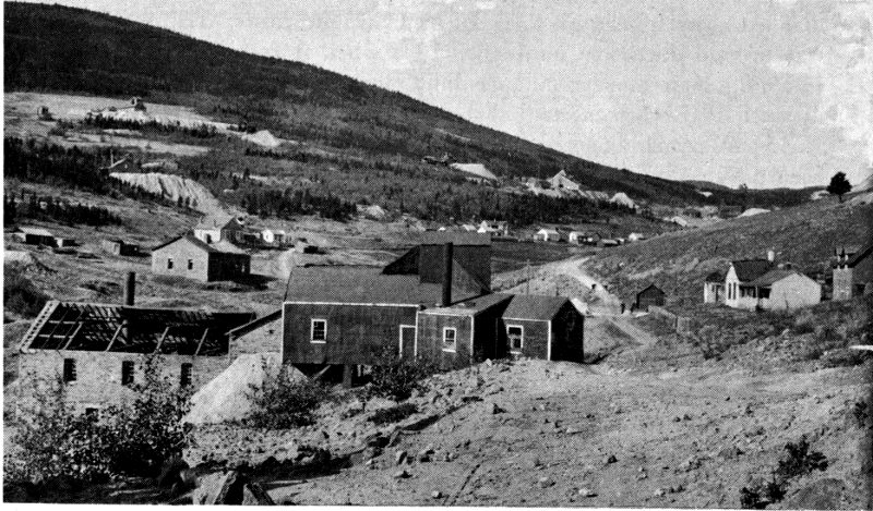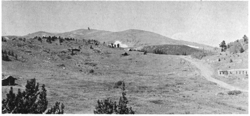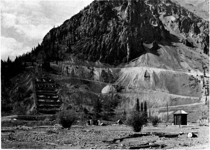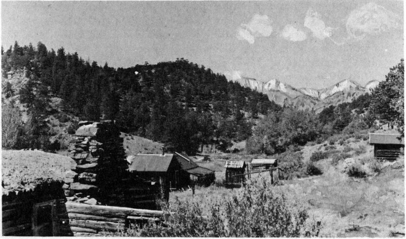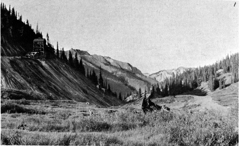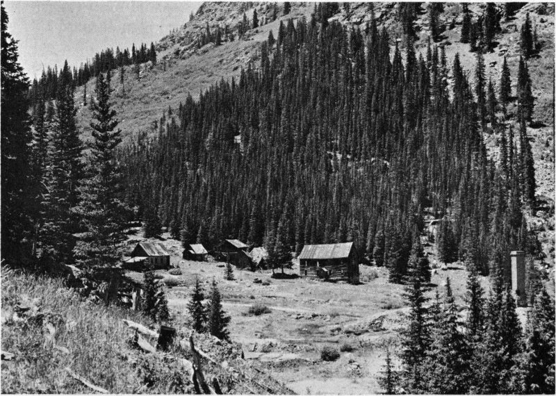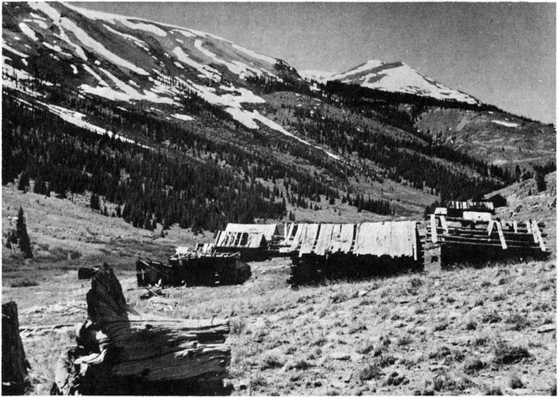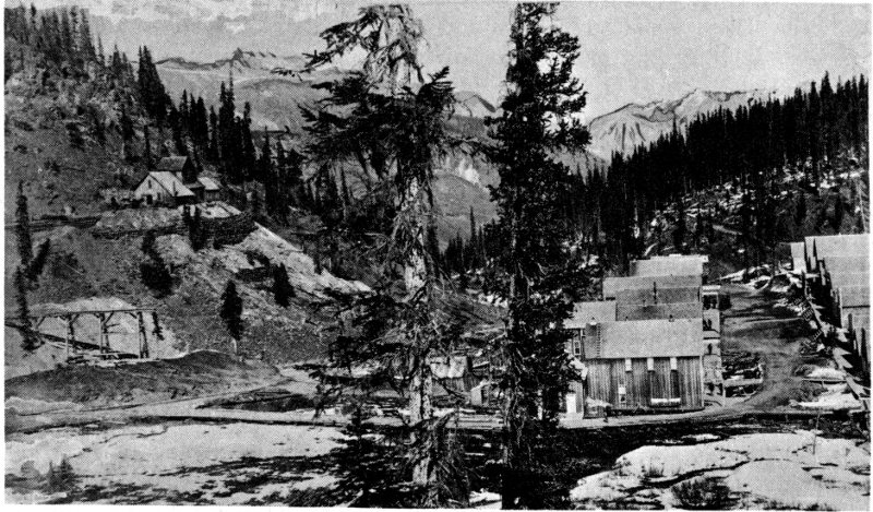 Shown are the London boardinghouse, mill and mine (far right). More miners lived down in Secreto Gulch to the left of this high ridge.