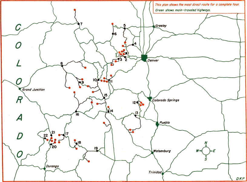 A plan for touring the whole state and a large folded-in map of Colorado serve as introduction to the special towns and separate tours that follow. On the large map, the towns suggested for starting points are shown as black dots and are numbered to correspond with the numbers of the individual tours. The ghost towns appear as red dots. On the smaller maps the starting points are shown as squares, and the ghost towns as solid circles. Dan has drawn them all with the double purpose of being accurate and helpfully clear.