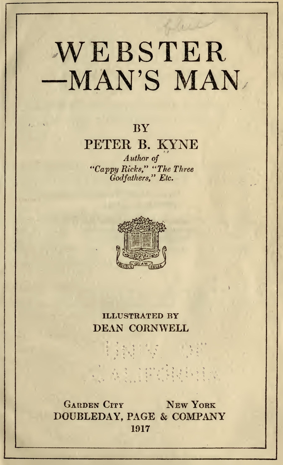 The Project Gutenberg EBook of Webster--Man's Man, by Peter B. Kyne This eBook is for the use of anyone anywhere in the United States and most other parts of the world at no cost and with almost no restrictions whatsoever. You may copy it, give it away or re-use it under the terms of the Project Gutenberg License included with this eBook or online at www.gutenberg.org. If you are not located in the United States, you'll have to check the laws of the country where you are located before using this ebook. Title: Webster--Man's Man Author: Peter B. Kyne Illustrator: Dean Cornwell Release Date: May 3, 2016 [EBook #51987] Last Updated: March 12, 2018 Language: English Character set encoding: UTF-8 *** START OF THIS PROJECT GUTENBERG EBOOK WEBSTER--MAN'S MAN *** Produced by David Widger from page images generously provided by the Internet Archive