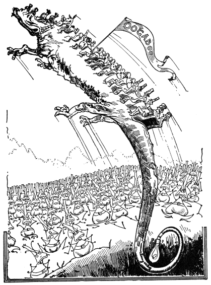 One of these men, however, was Jo Candy, and he would not go at all. No promises could tempt him, nor could threats move him. He said he must remain at home to harvest his crop of jackson-balls, lemon-drops, bonbons and chocolate-creams. Also he had large fields of crackerjack and buttered pop corn to be mowed and threshed, and he was determined not to disappoint the children of Oogaboo by going away to conquer the world and so let the candy crop spoil.