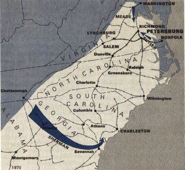 Map showing the network of railroads and the strategic location of Petersburg to Richmond. The shaded area is the approximate line of Union control in early 1864. The three arrows indicate the major drives planned by the Union army for 1864. (Railroads serving Rich. and Petersburg are in heavy lines.)