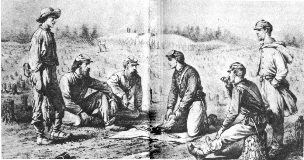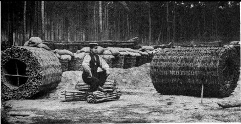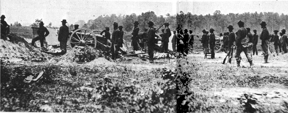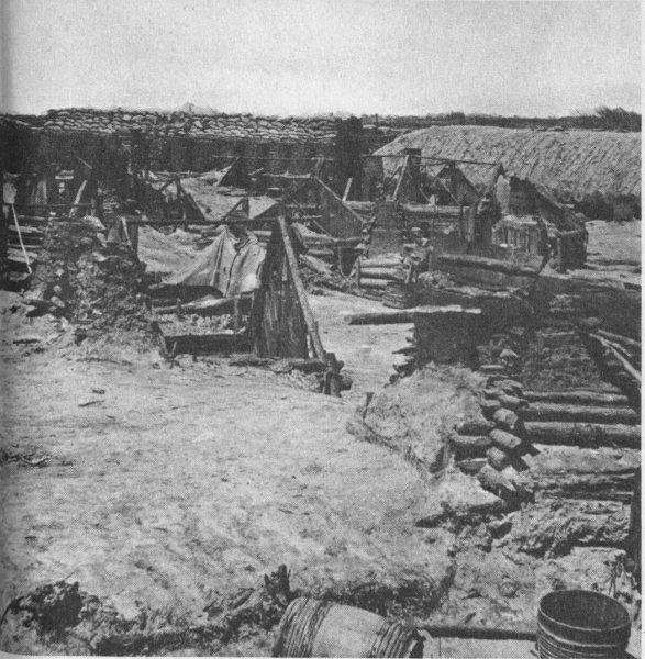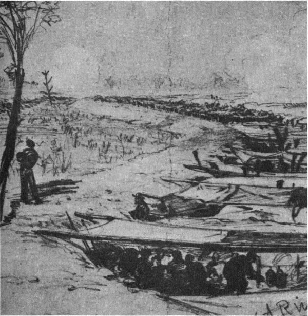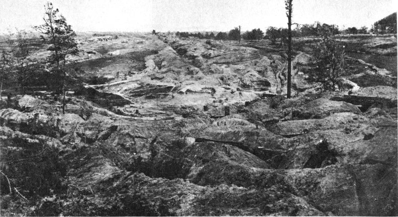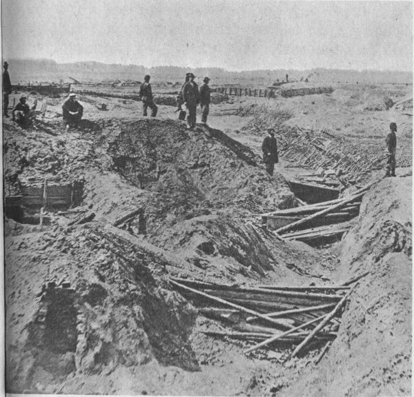A section of the Confederate defense lines around Petersburg. Note the use of wickerware (gabions), sharpened stakes (fraises), and branches (abatis) to protect the position.
