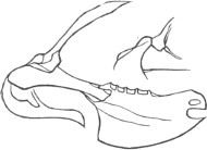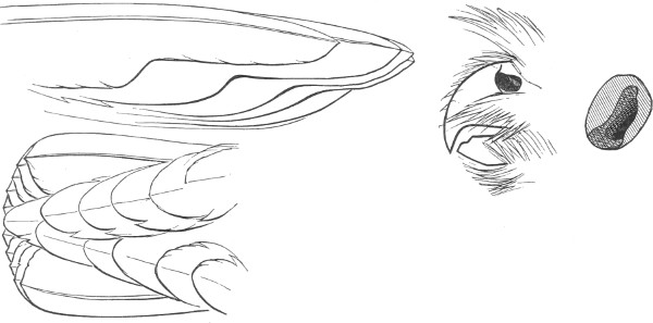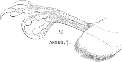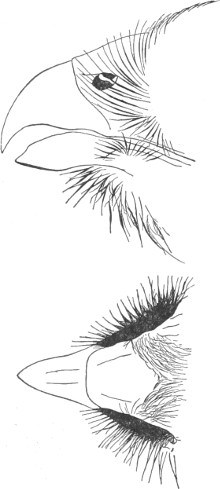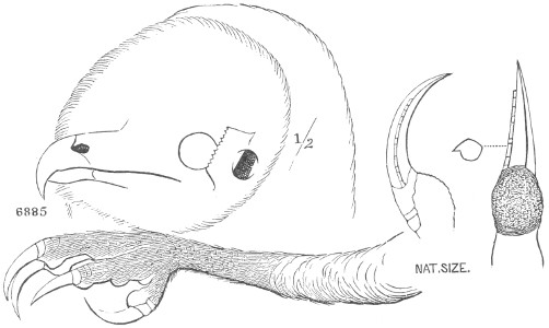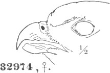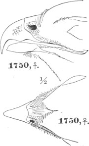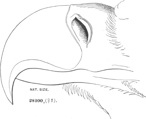 b. Cere, on top, less than the chord of the culmen; gradually ascending basally, or level (not arched). Ear-conch nearly the height of the skull, with the operculum extending only a part of its full length, or wanting entirely.